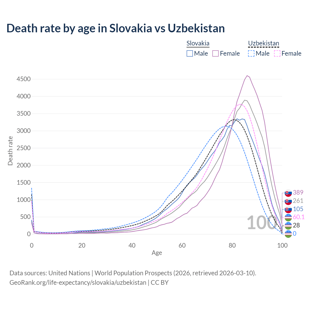 This life expectancy calculator shows the odds of living to 100, 95, 90, and below based on current age for both males and females in Slovakia and Uzbekistan, along with mean and median age of death. The calculations are based on the 2026 life tables (actuarial tables) from the UN World Population Prospects.