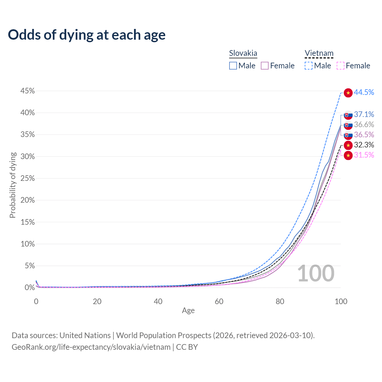 This life expectancy calculator shows the odds of living to 100, 95, 90, and below based on current age for both males and females in Slovakia and Vietnam, along with mean and median age of death. The calculations are based on the 2026 life tables (actuarial tables) from the UN World Population Prospects.