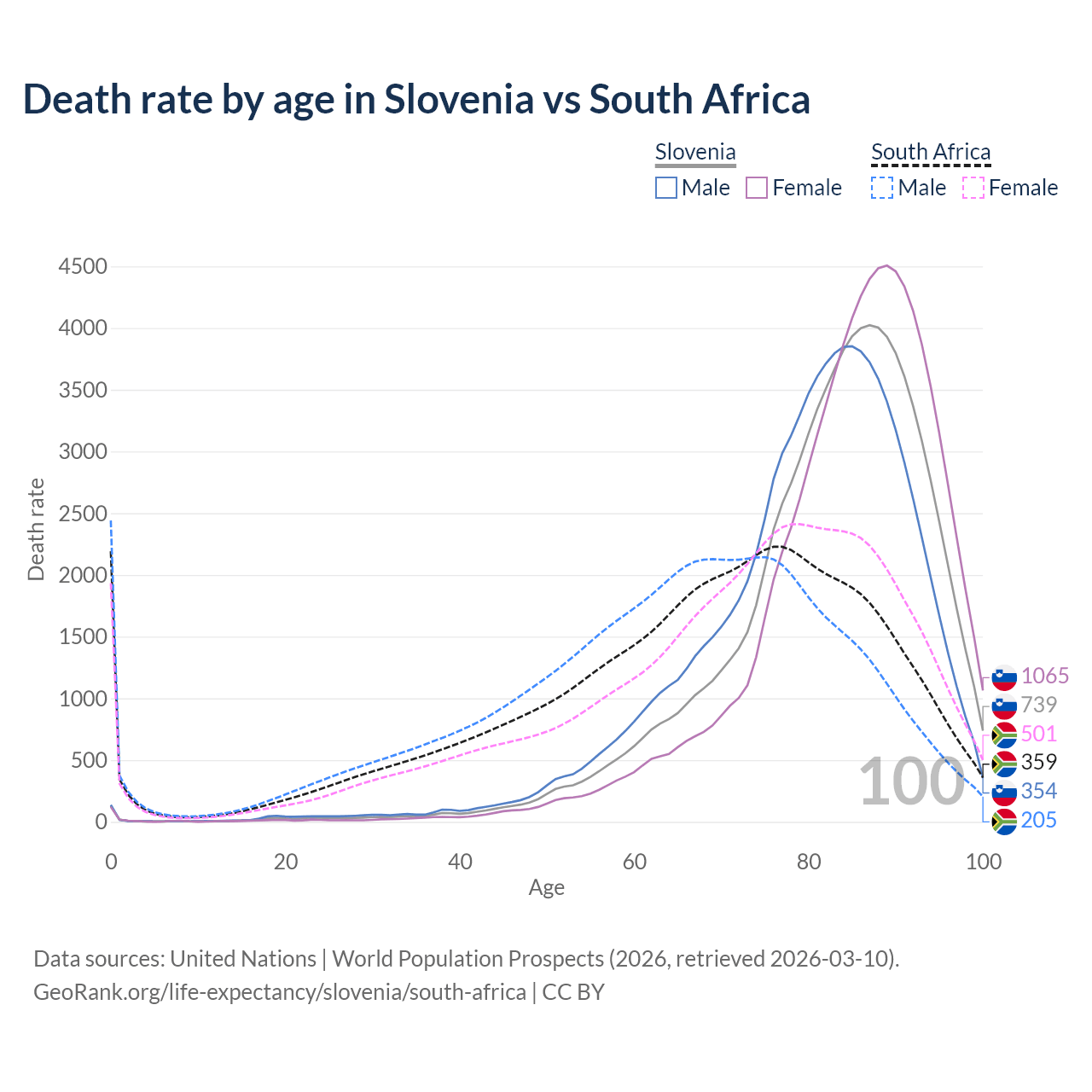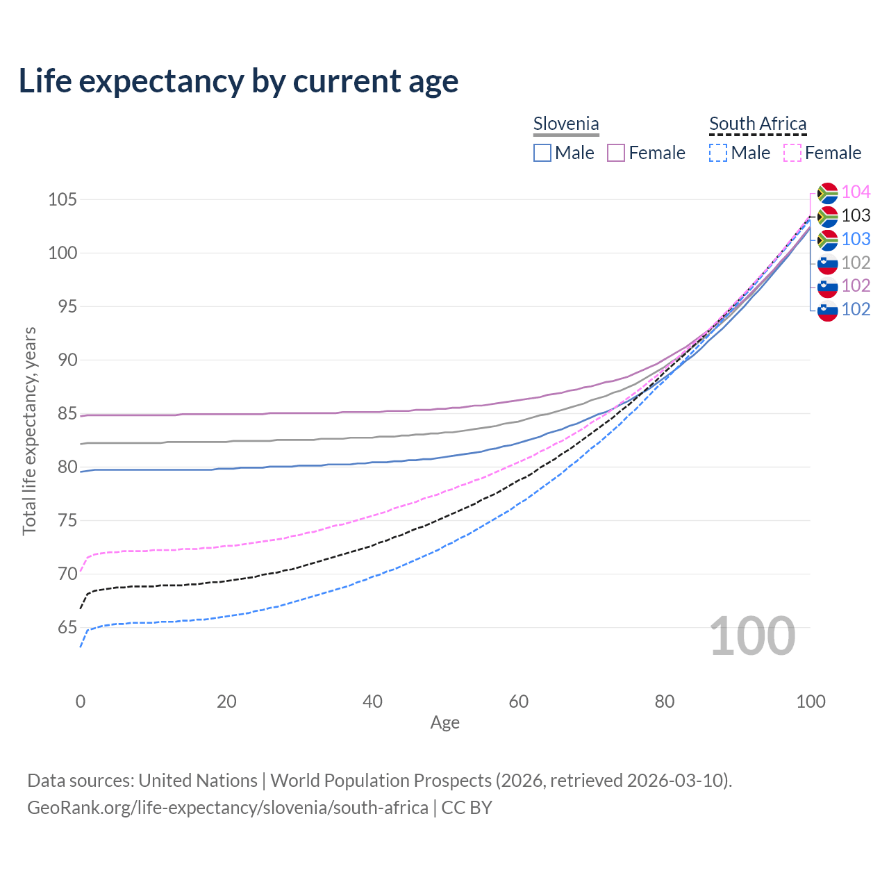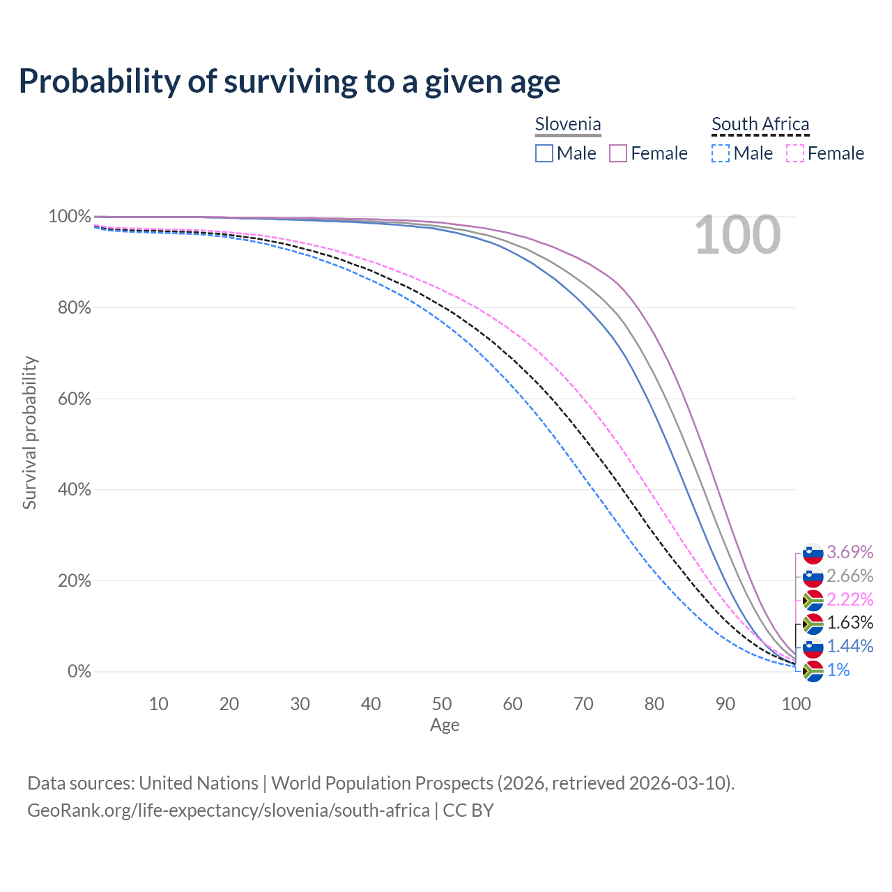 This life expectancy calculator shows the odds of living to 100, 95, 90, and below based on current age for both males and females in Slovenia and South Africa, along with mean and median age of death. The calculations are based on the 2026 life tables (actuarial tables) from the UN World Population Prospects.