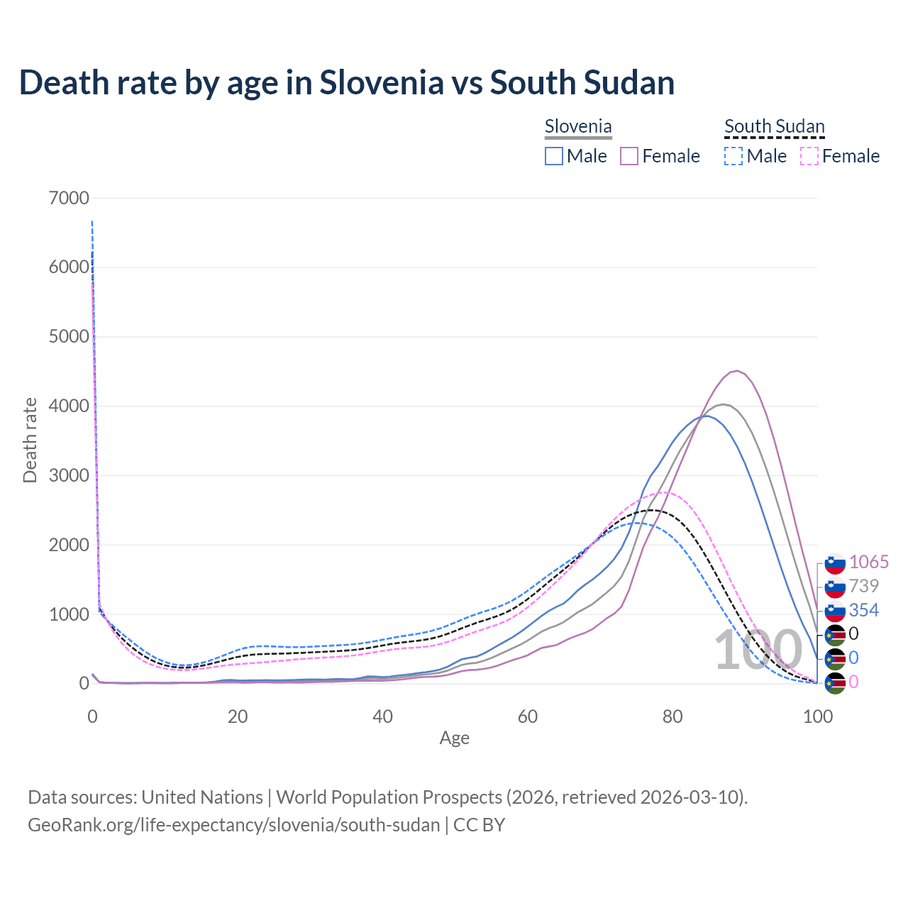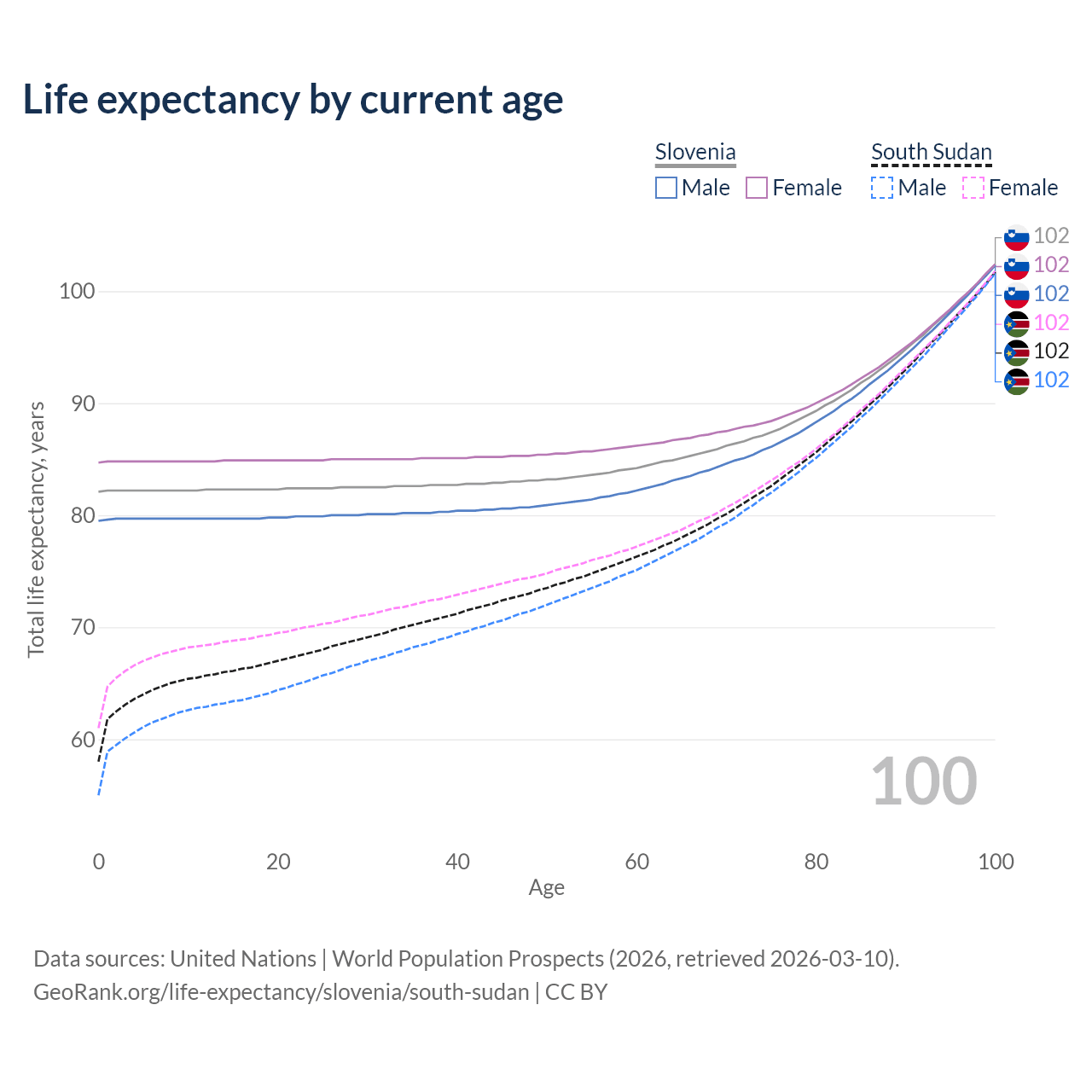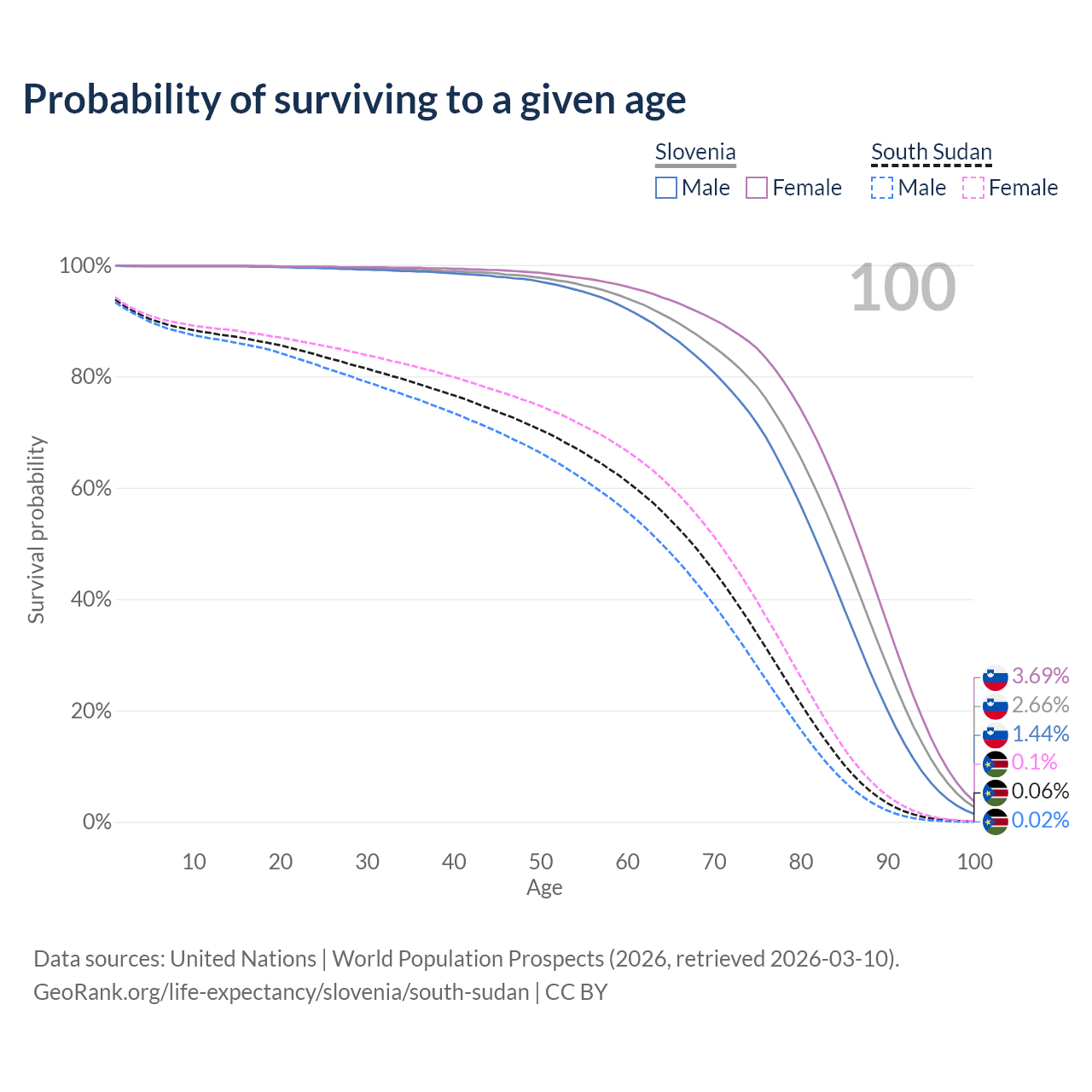 This life expectancy calculator shows the odds of living to 100, 95, 90, and below based on current age for both males and females in Slovenia and South Sudan, along with mean and median age of death. The calculations are based on the 2026 life tables (actuarial tables) from the UN World Population Prospects.