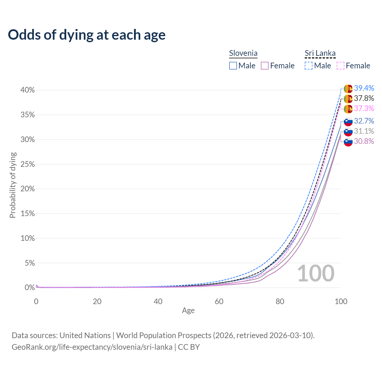 This life expectancy calculator shows the odds of living to 100, 95, 90, and below based on current age for both males and females in Slovenia and Sri Lanka, along with mean and median age of death. The calculations are based on the 2026 life tables (actuarial tables) from the UN World Population Prospects.