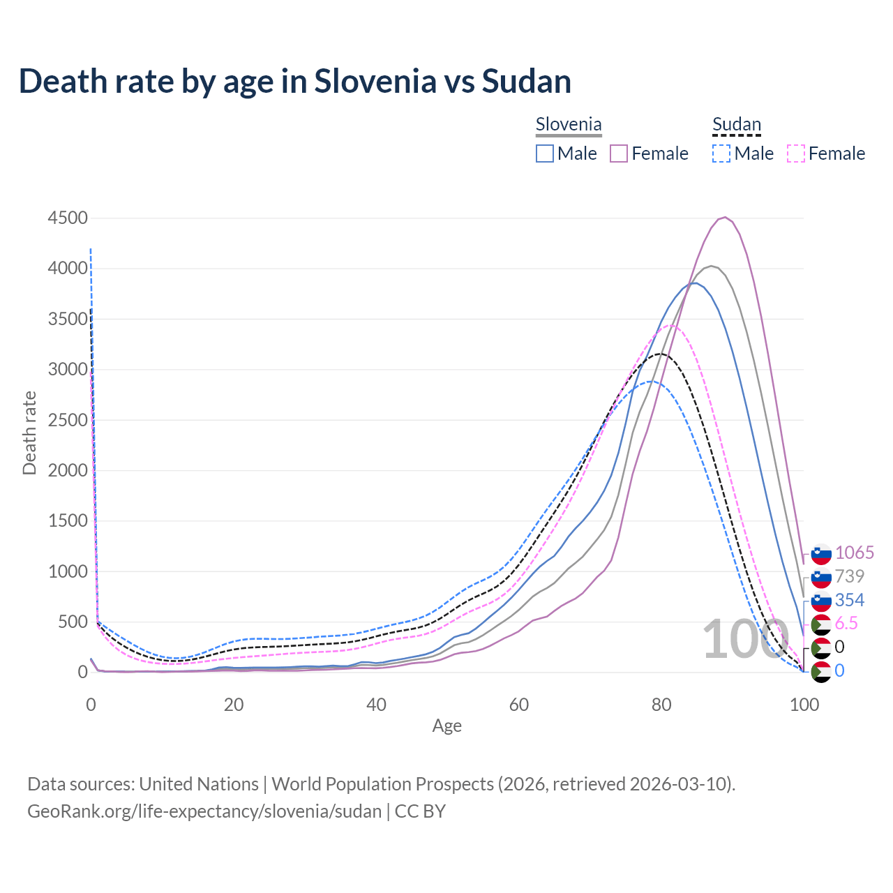 In Slovenia, the most common age of death is 87, compared to 0 in Sudan. The median age of death is 84.4 in Slovenia and 74.1 in Sudan, meaning only half of each cohort is expected to live past that age.