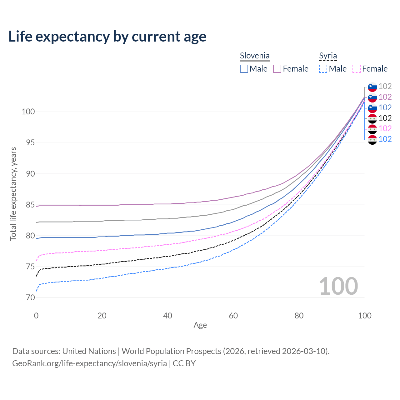 This life expectancy calculator shows the odds of living to 100, 95, 90, and below based on current age for both males and females in Slovenia and Syria, along with mean and median age of death. The calculations are based on the 2026 life tables (actuarial tables) from the UN World Population Prospects.