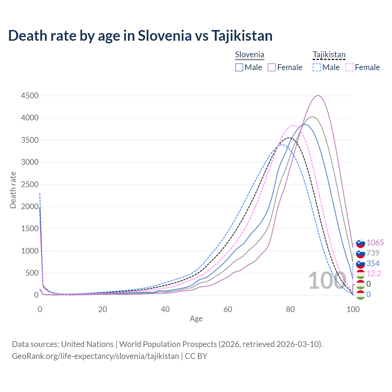 In Slovenia, the most common age of death is 87, compared to 80 in Tajikistan. The median age of death is 84.4 in Slovenia and 76 in Tajikistan, meaning only half of each cohort is expected to live past that age.