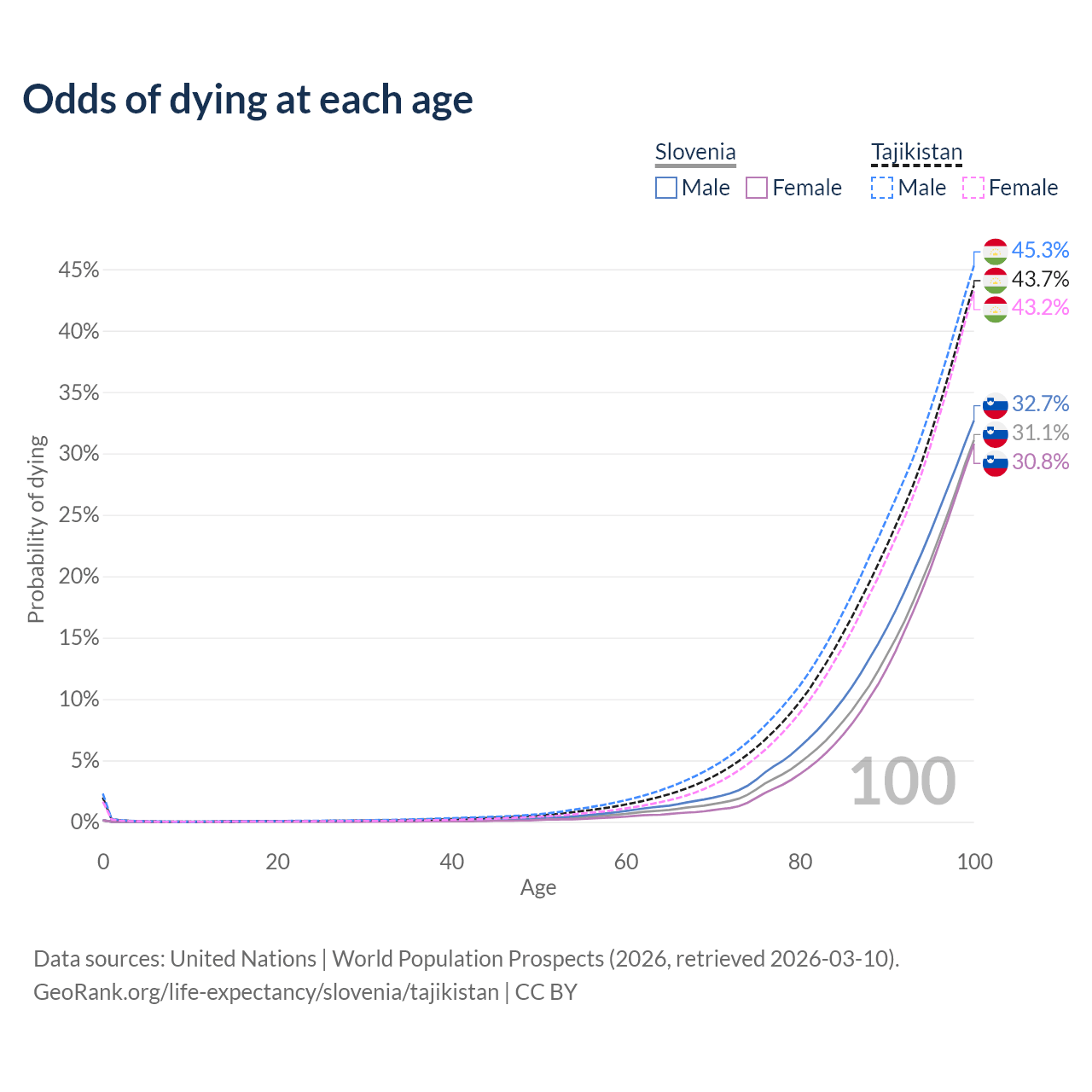 This life expectancy calculator shows the odds of living to 100, 95, 90, and below based on current age for both males and females in Slovenia and Tajikistan, along with mean and median age of death. The calculations are based on the 2026 life tables (actuarial tables) from the UN World Population Prospects.