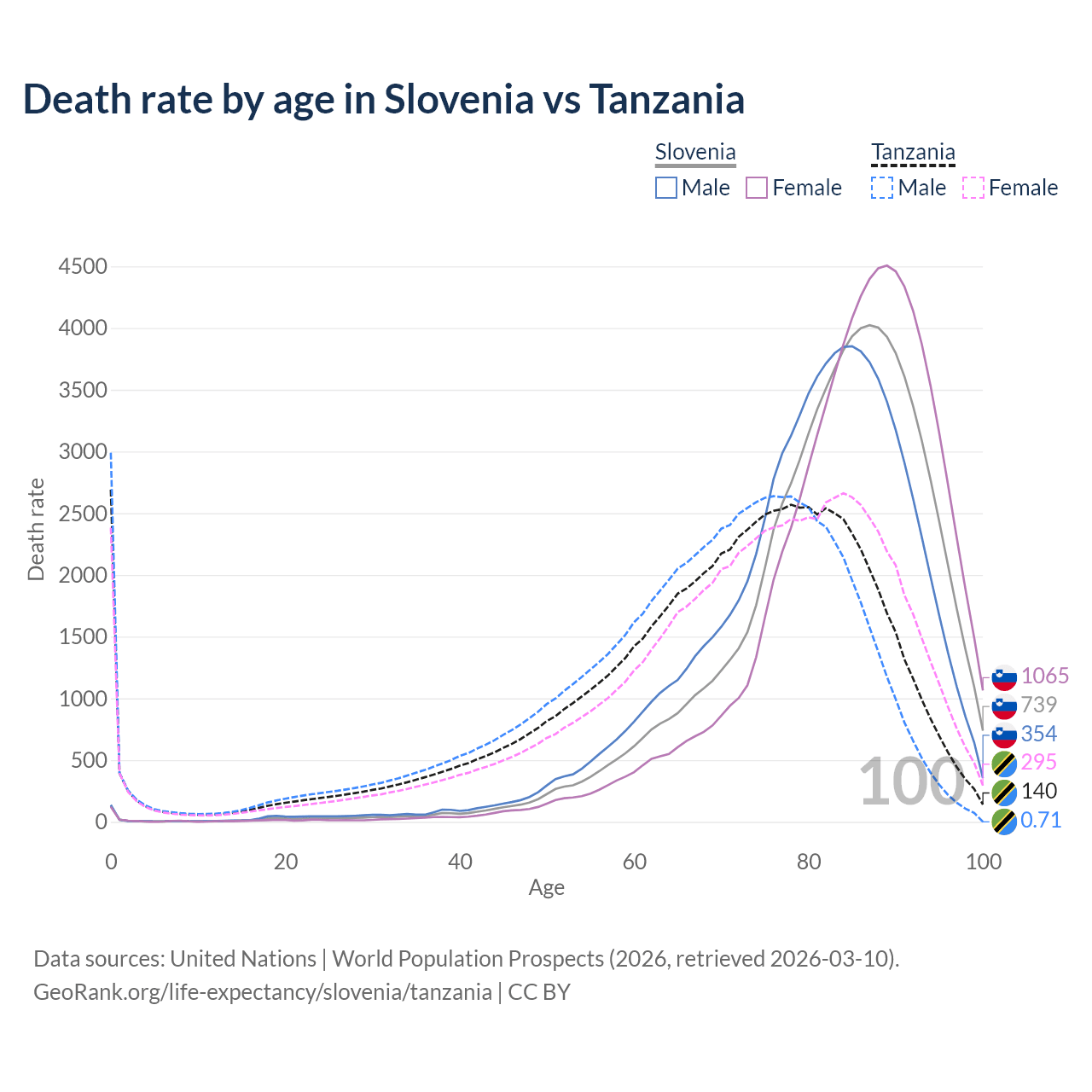 In Slovenia, the most common age of death is 87, compared to 0 in Tanzania. The median age of death is 84.4 in Slovenia and 72.6 in Tanzania, meaning only half of each cohort is expected to live past that age.