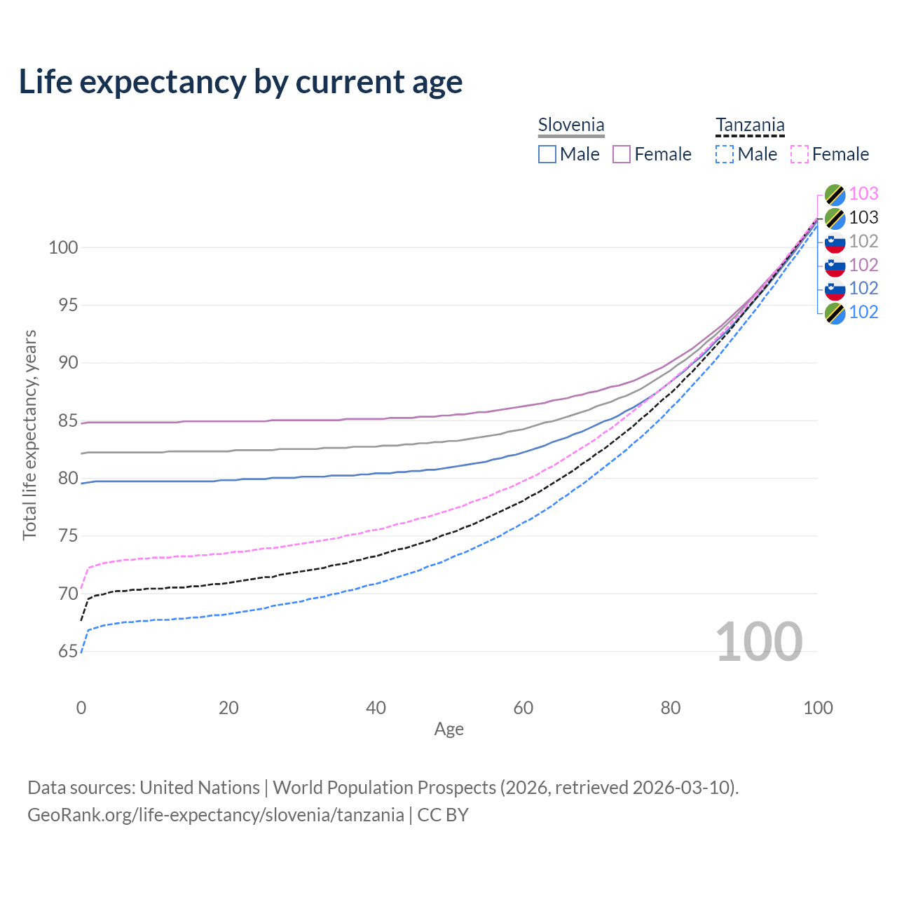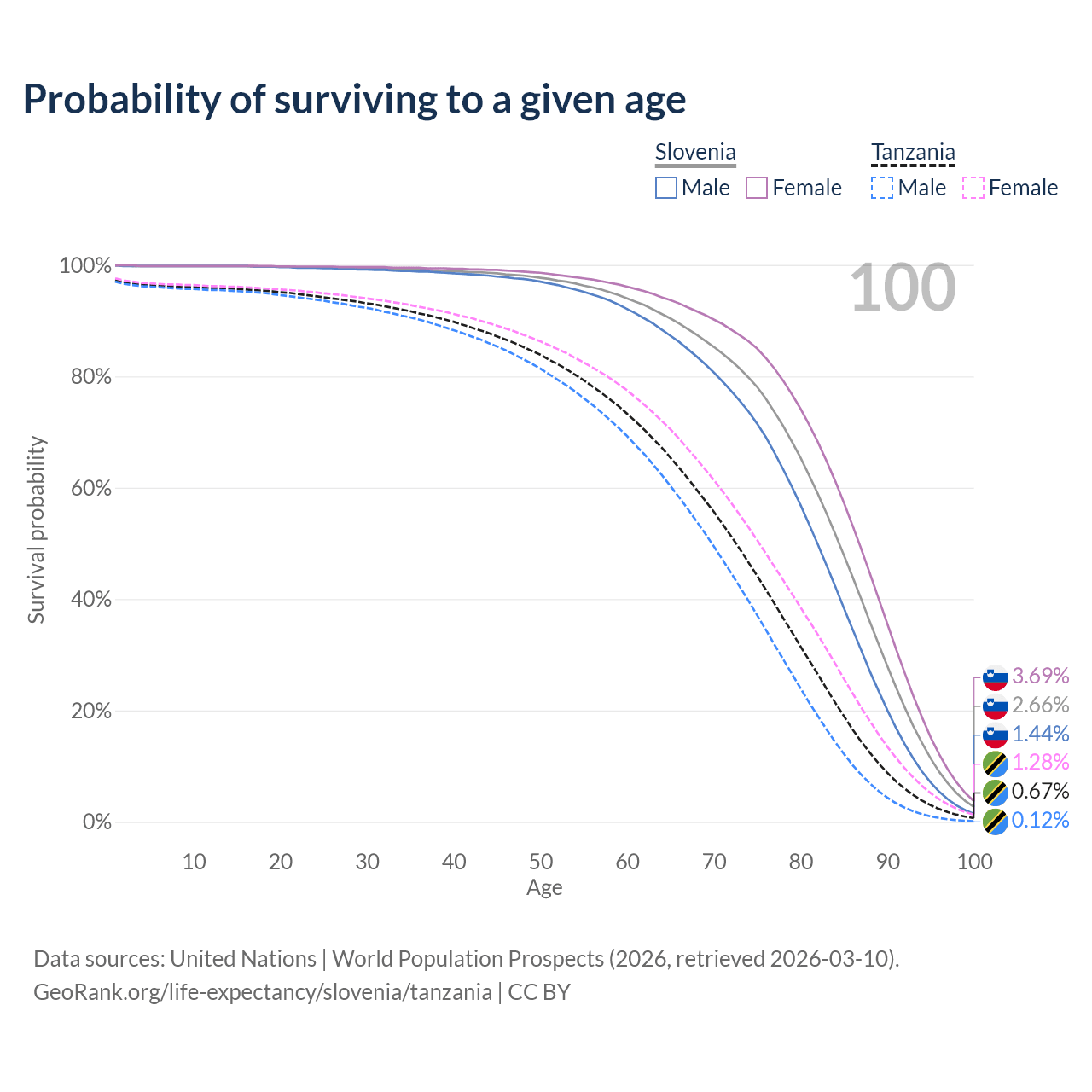 This life expectancy calculator shows the odds of living to 100, 95, 90, and below based on current age for both males and females in Slovenia and Tanzania, along with mean and median age of death. The calculations are based on the 2026 life tables (actuarial tables) from the UN World Population Prospects.