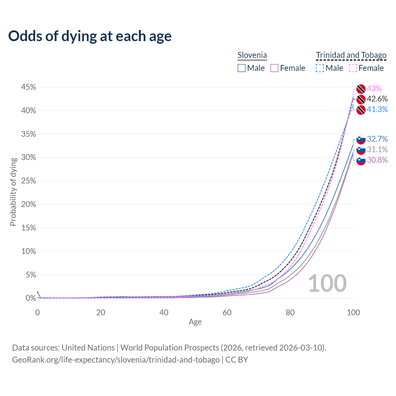 This life expectancy calculator shows the odds of living to 100, 95, 90, and below based on current age for both males and females in Slovenia and Trinidad and Tobago, along with mean and median age of death. The calculations are based on the 2026 life tables (actuarial tables) from the UN World Population Prospects.