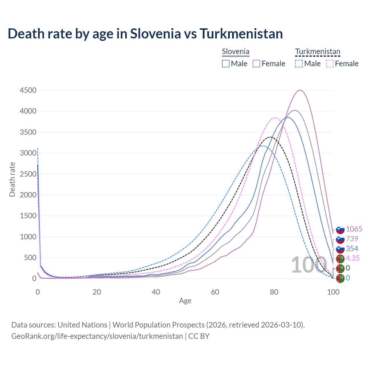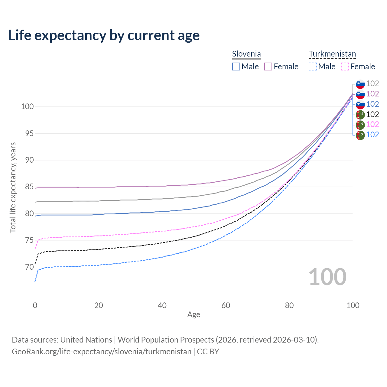 This life expectancy calculator shows the odds of living to 100, 95, 90, and below based on current age for both males and females in Slovenia and Turkmenistan, along with mean and median age of death. The calculations are based on the 2026 life tables (actuarial tables) from the UN World Population Prospects.