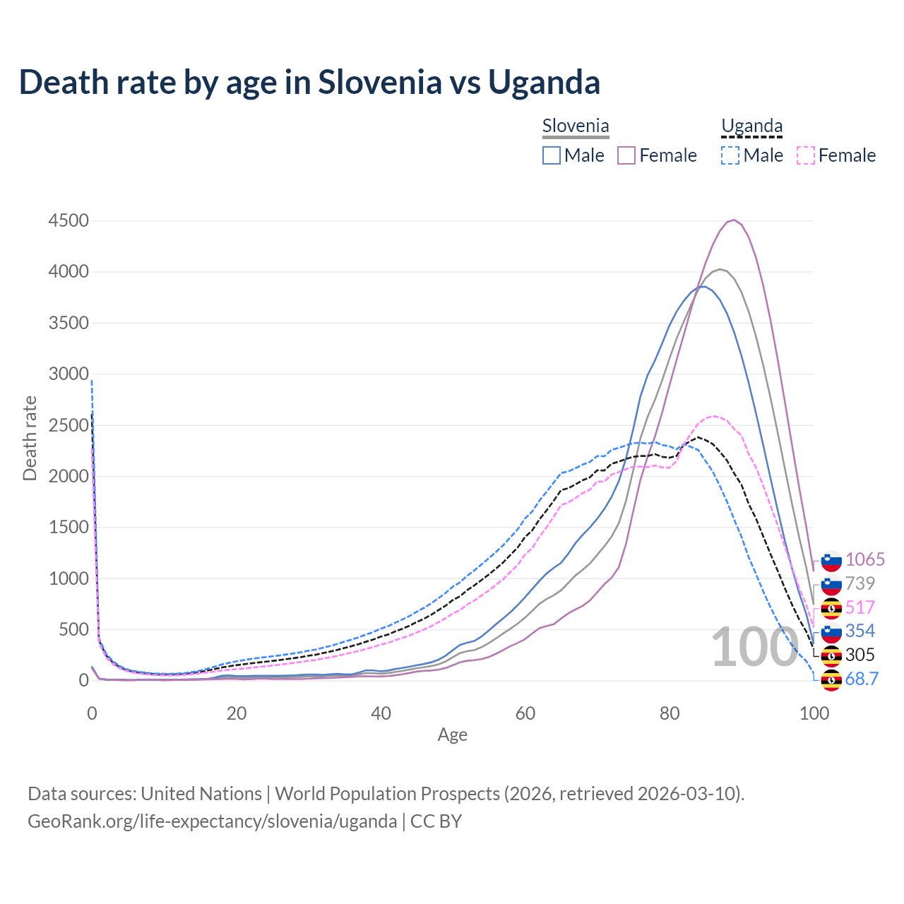 In Slovenia, the most common age of death is 87, compared to 0 in Uganda. The median age of death is 84.4 in Slovenia and 73.3 in Uganda, meaning only half of each cohort is expected to live past that age.