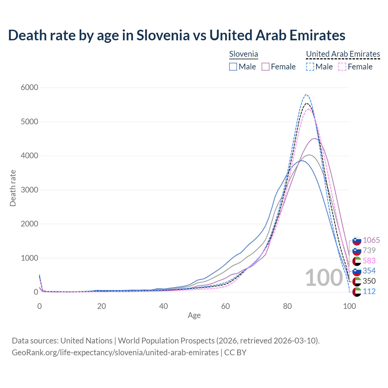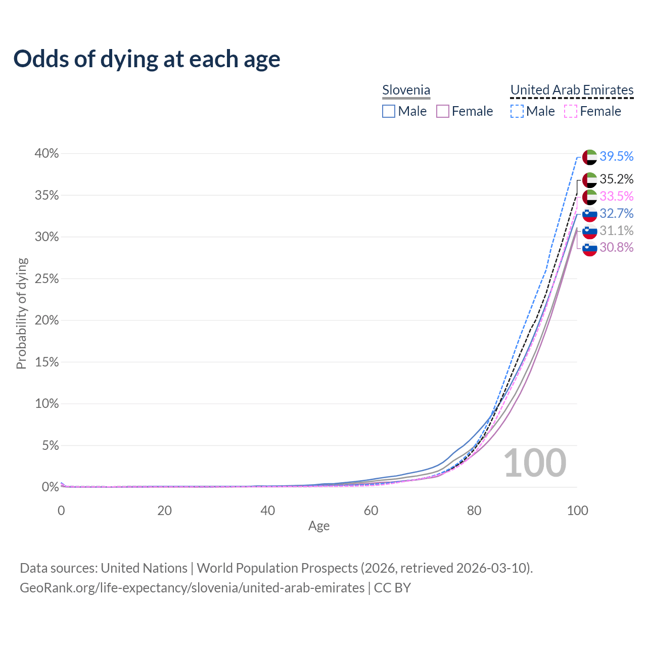 This life expectancy calculator shows the odds of living to 100, 95, 90, and below based on current age for both males and females in Slovenia and the United Arab Emirates, along with mean and median age of death. The calculations are based on the 2026 life tables (actuarial tables) from the UN World Population Prospects.