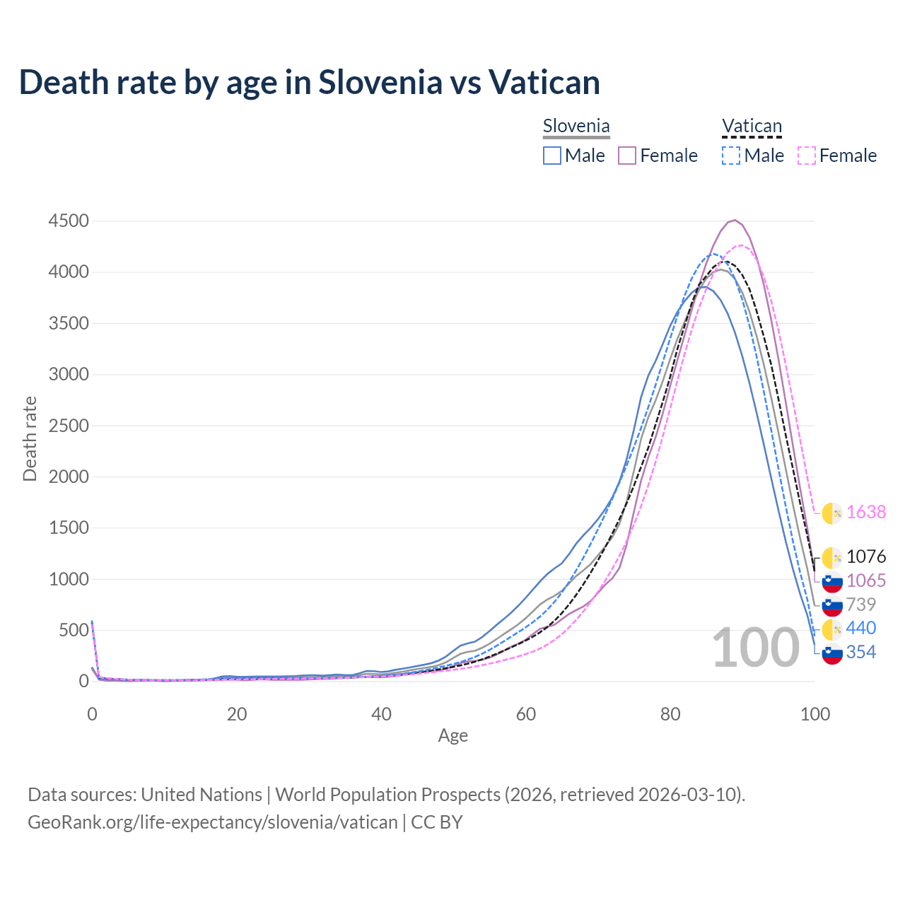 In Slovenia, the most common age of death is 87, compared to 88 in the Vatican. The median age of death is 84.4 in Slovenia and 85.7 in the Vatican, meaning only half of each cohort is expected to live past that age.
