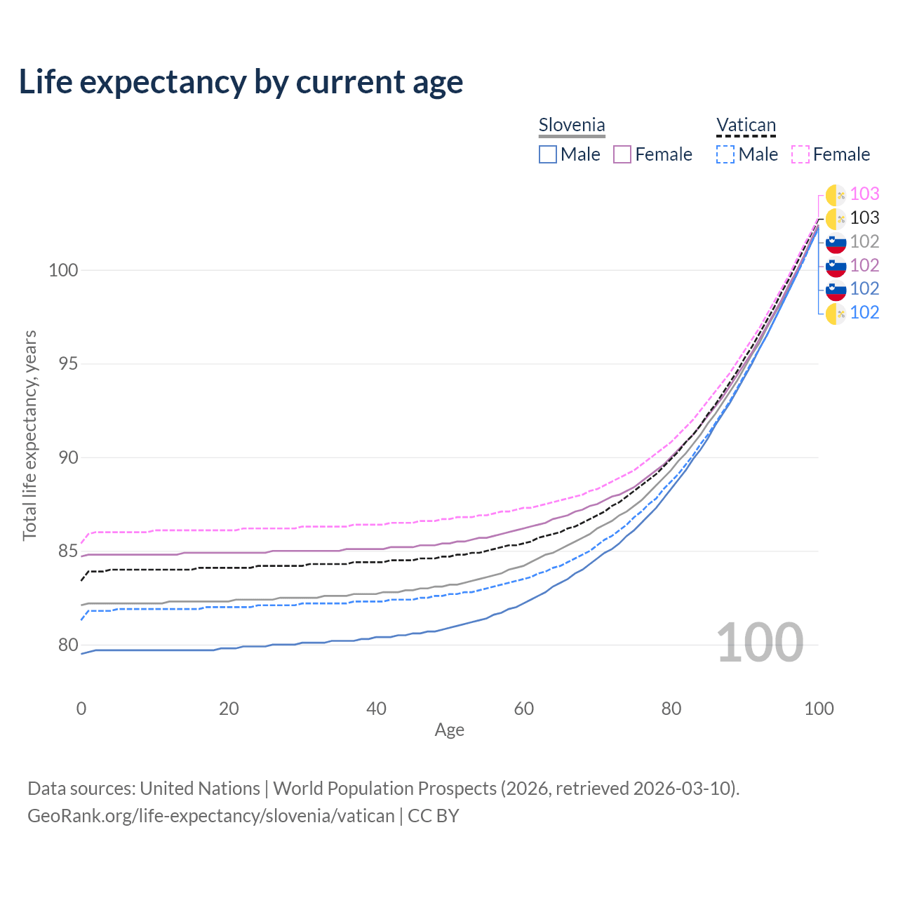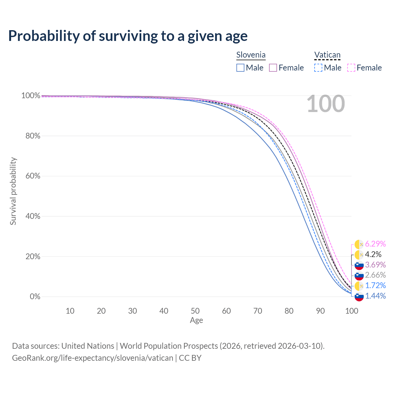 This life expectancy calculator shows the odds of living to 100, 95, 90, and below based on current age for both males and females in Slovenia and the Vatican, along with mean and median age of death. The calculations are based on the 2026 life tables (actuarial tables) from the UN World Population Prospects.