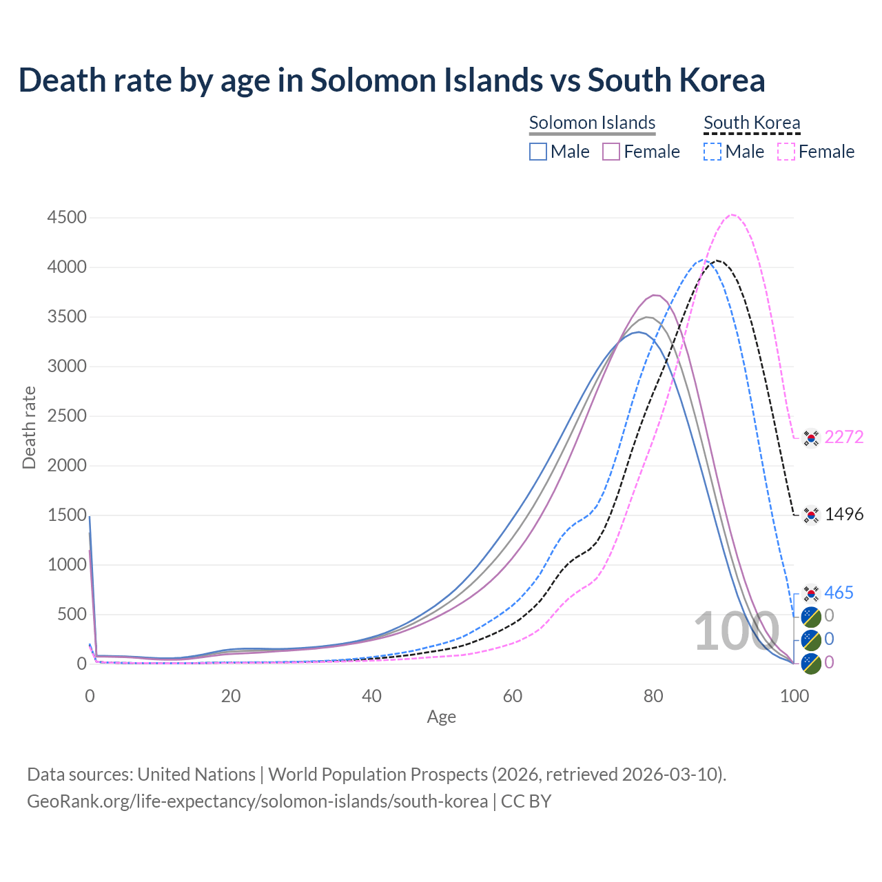 In the Solomon Islands, the most common age of death is 79, compared to 89 in South Korea. The median age of death is 74.9 in the Solomon Islands and 86.8 in South Korea, meaning only half of each cohort is expected to live past that age.