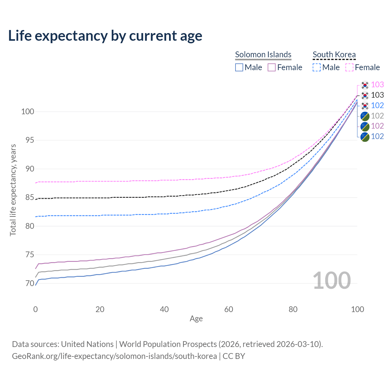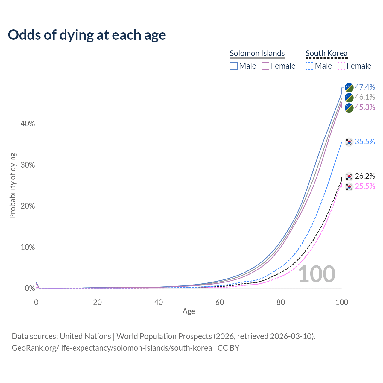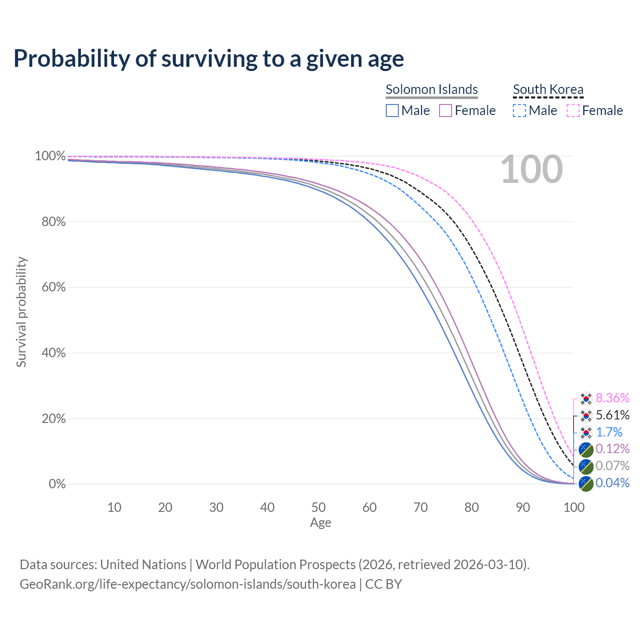 This life expectancy calculator shows the odds of living to 100, 95, 90, and below based on current age for both males and females in the Solomon Islands and South Korea, along with mean and median age of death. The calculations are based on the 2026 life tables (actuarial tables) from the UN World Population Prospects.