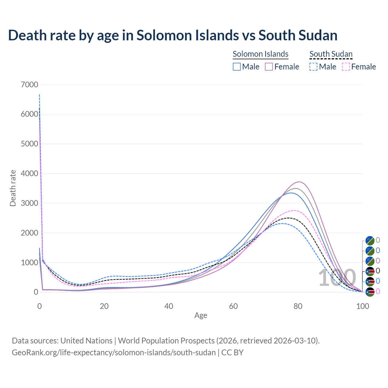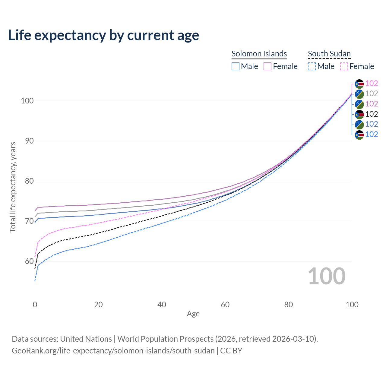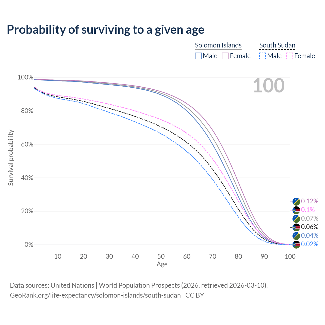 This life expectancy calculator shows the odds of living to 100, 95, 90, and below based on current age for both males and females in the Solomon Islands and South Sudan, along with mean and median age of death. The calculations are based on the 2026 life tables (actuarial tables) from the UN World Population Prospects.