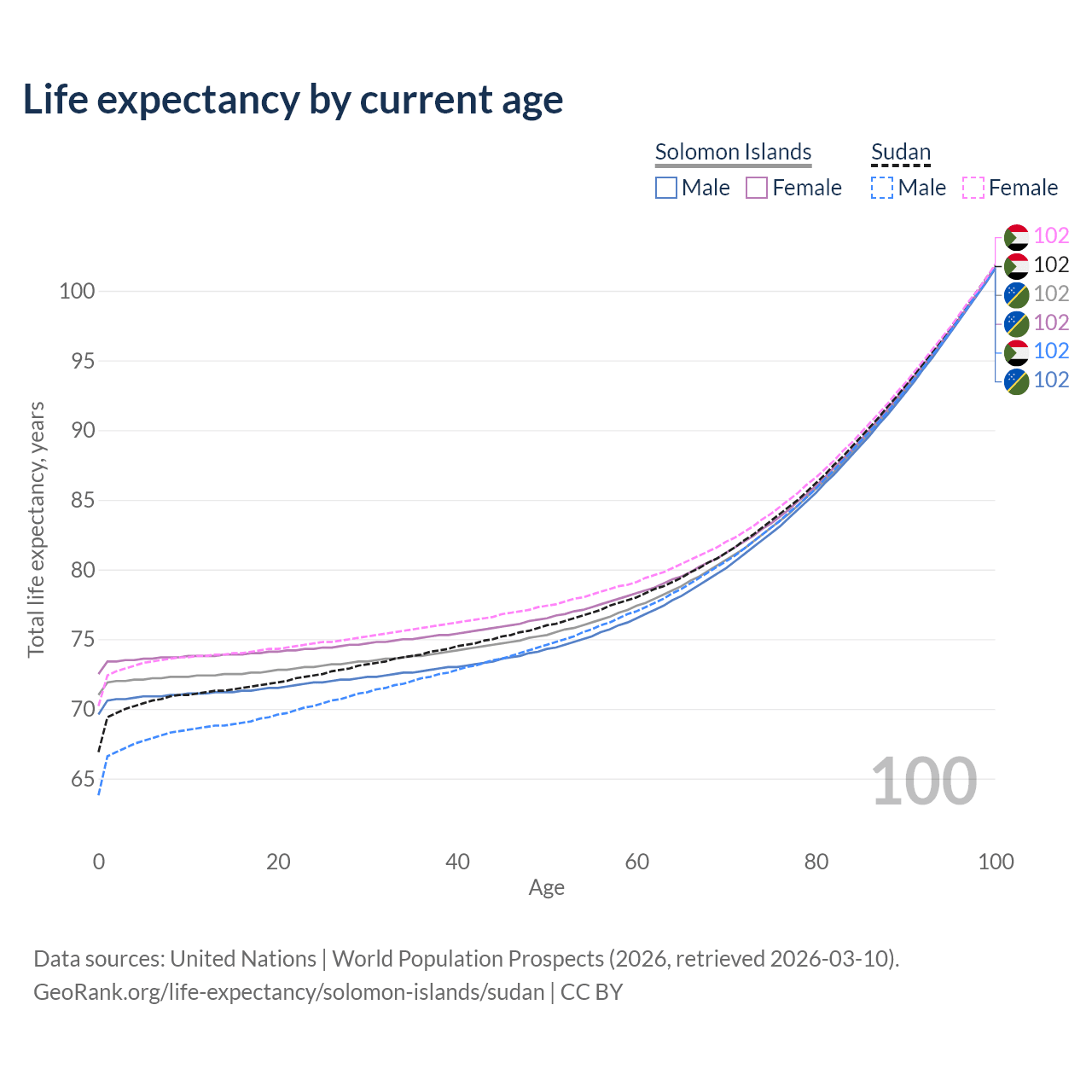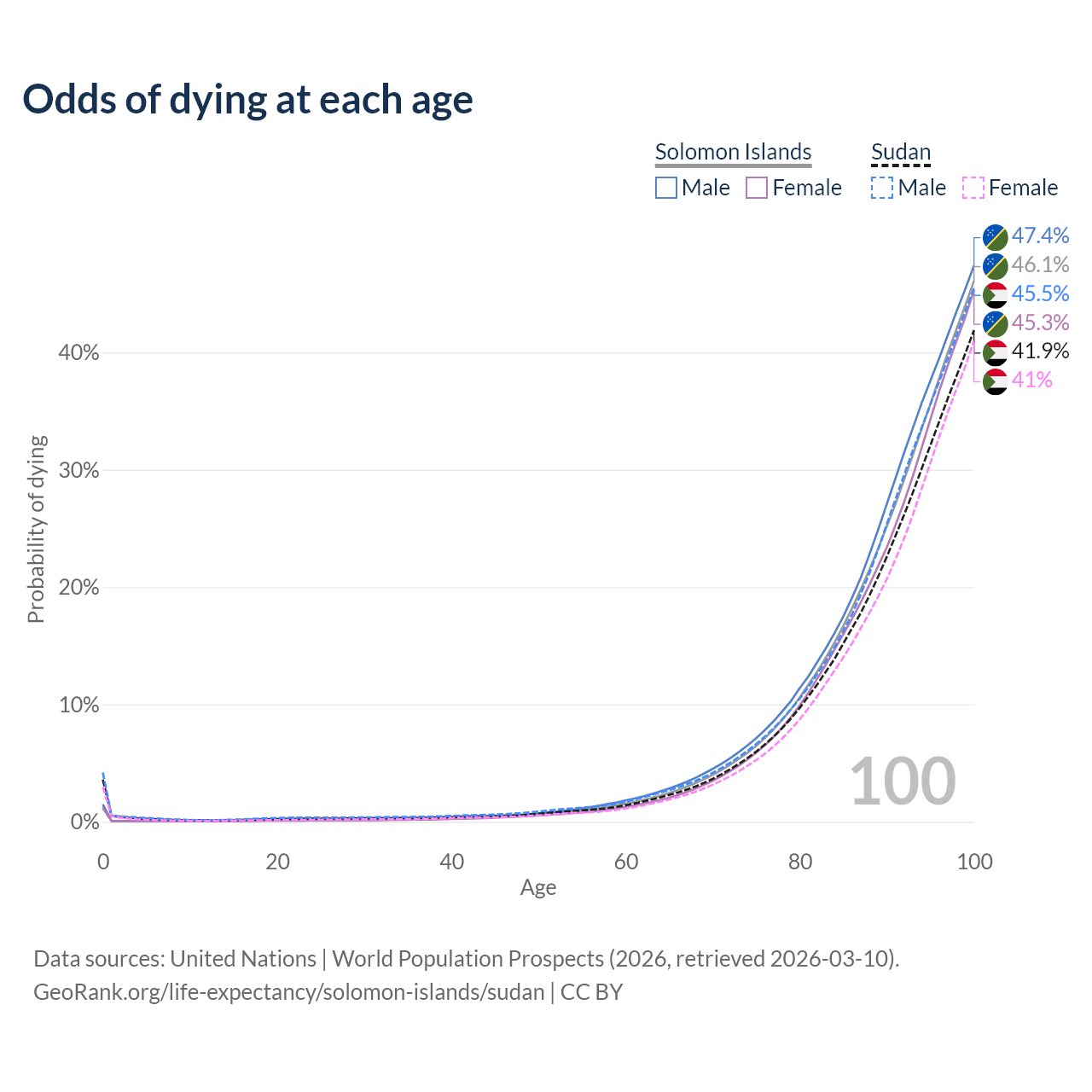 This life expectancy calculator shows the odds of living to 100, 95, 90, and below based on current age for both males and females in the Solomon Islands and Sudan, along with mean and median age of death. The calculations are based on the 2026 life tables (actuarial tables) from the UN World Population Prospects.