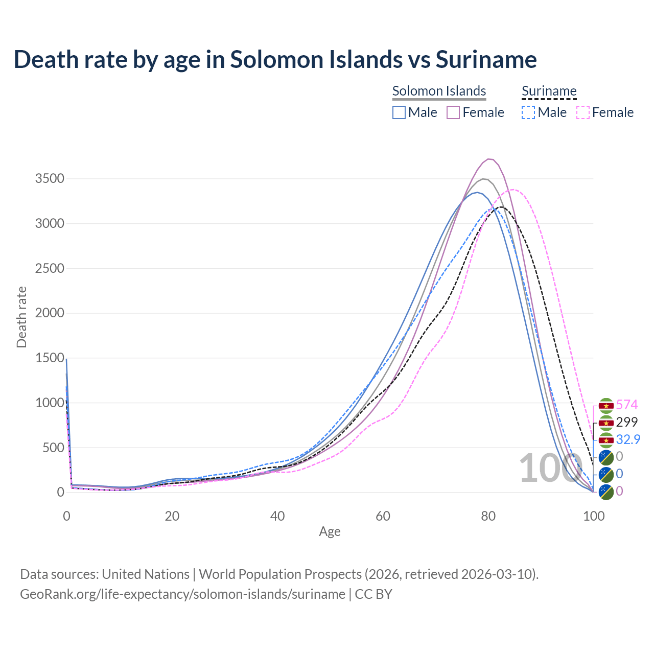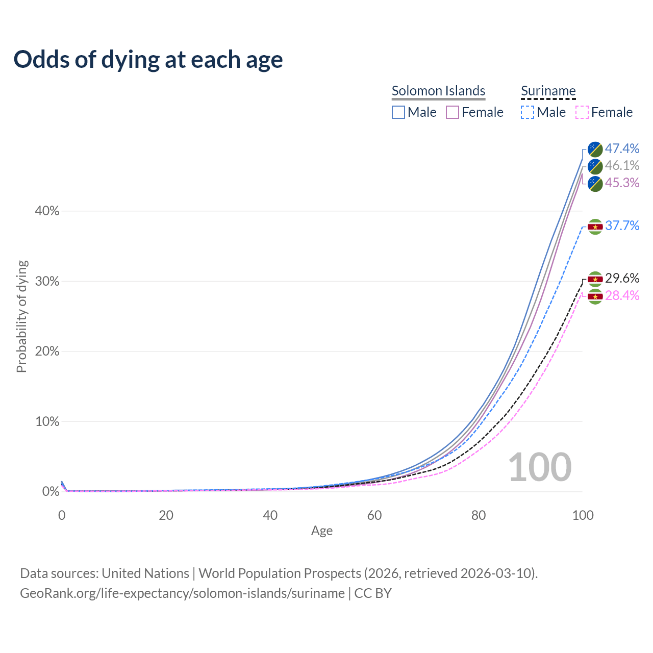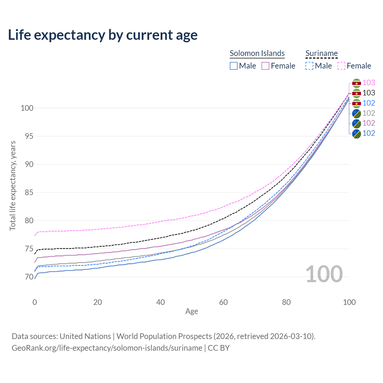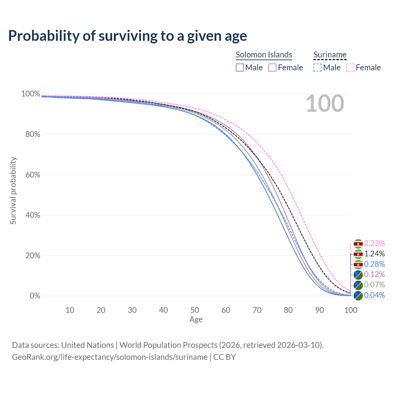 This life expectancy calculator shows the odds of living to 100, 95, 90, and below based on current age for both males and females in the Solomon Islands and Suriname, along with mean and median age of death. The calculations are based on the 2026 life tables (actuarial tables) from the UN World Population Prospects.