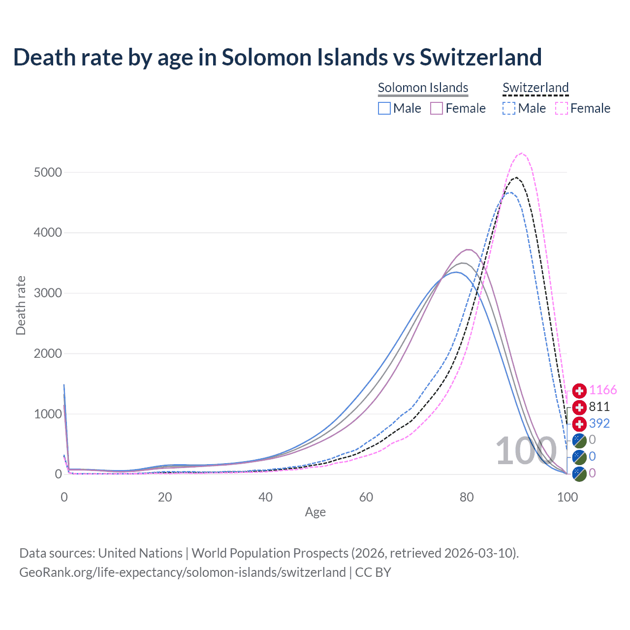 In the Solomon Islands, the most common age of death is 79, compared to 90 in Switzerland. The median age of death is 74.9 in the Solomon Islands and 87.2 in Switzerland, meaning only half of each cohort is expected to live past that age.