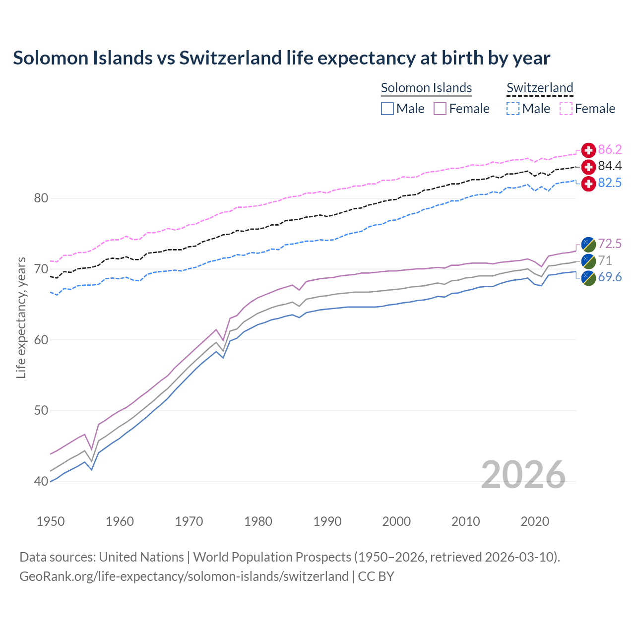 The average life expectancy at birth is 71 years in the Solomon Islands vs 84.4 in Switzerland. The Solomon Islands is ranked 133/197 by life expectancy, and Switzerland is 6/197. In the Solomon Islands, the life expectancy is 69.6 years for males and 72.5 years for females. In Switzerland, it's 82.5 years for males and 86.2 years for females.