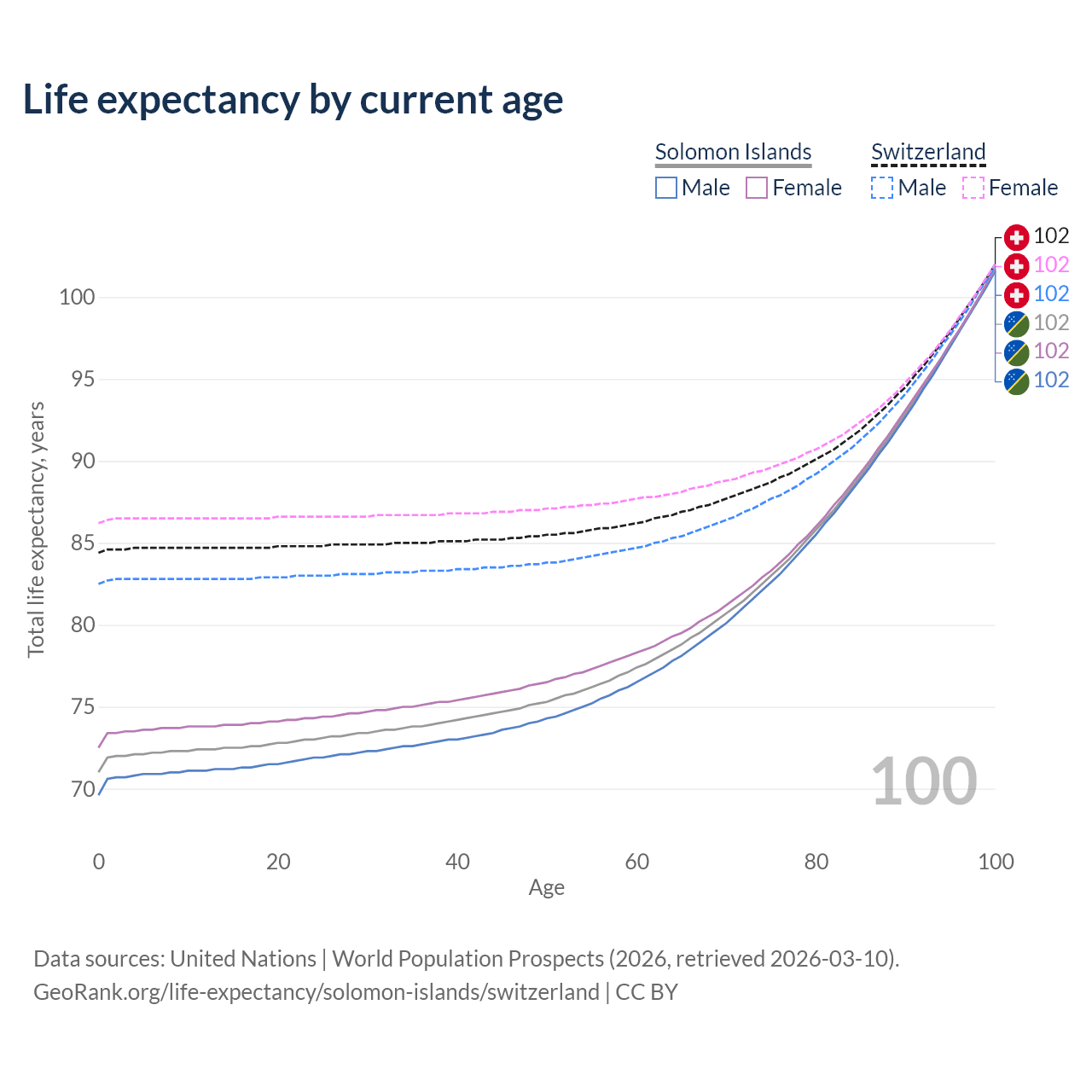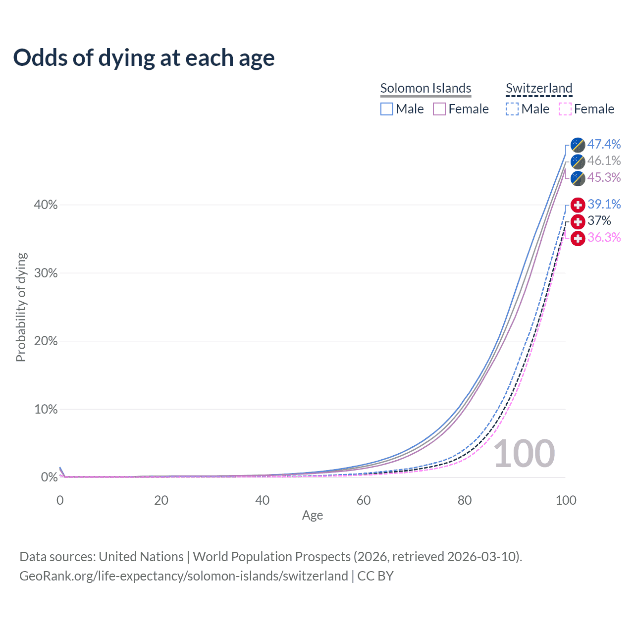 This life expectancy calculator shows the odds of living to 100, 95, 90, and below based on current age for both males and females in the Solomon Islands and Switzerland, along with mean and median age of death. The calculations are based on the 2026 life tables (actuarial tables) from the UN World Population Prospects.