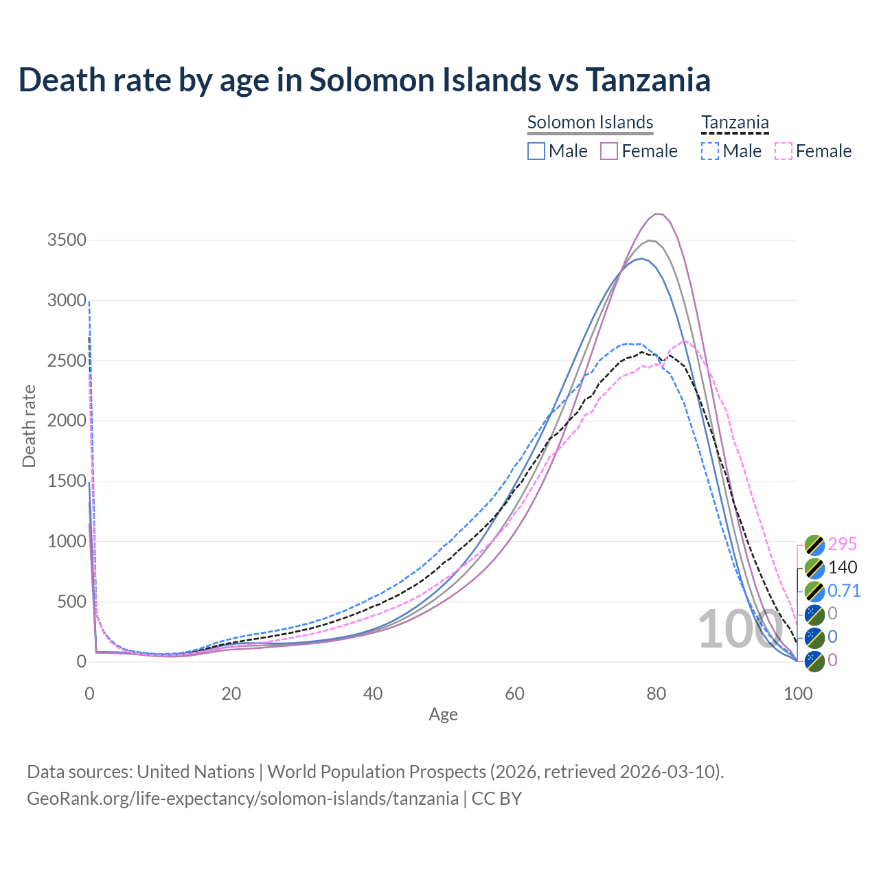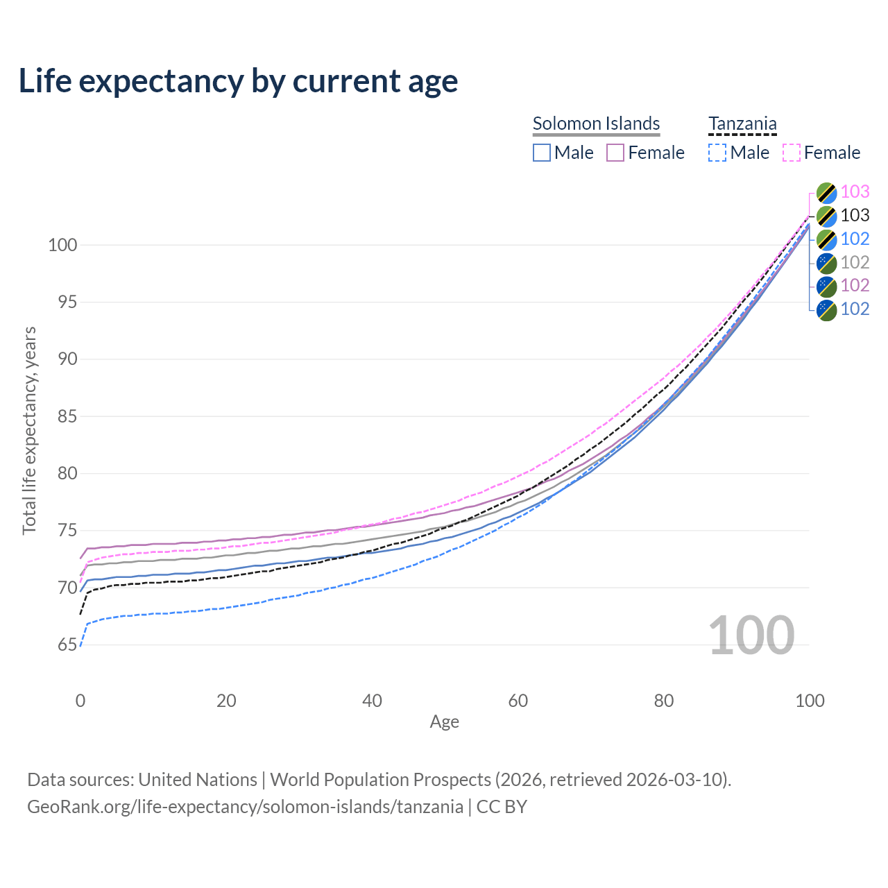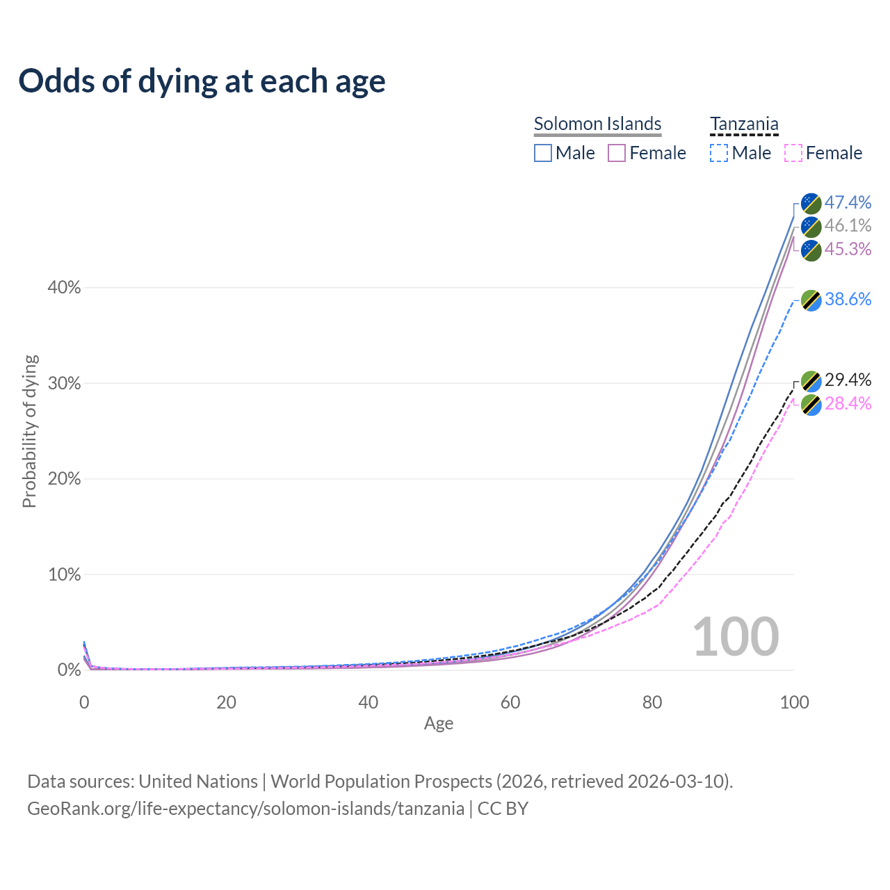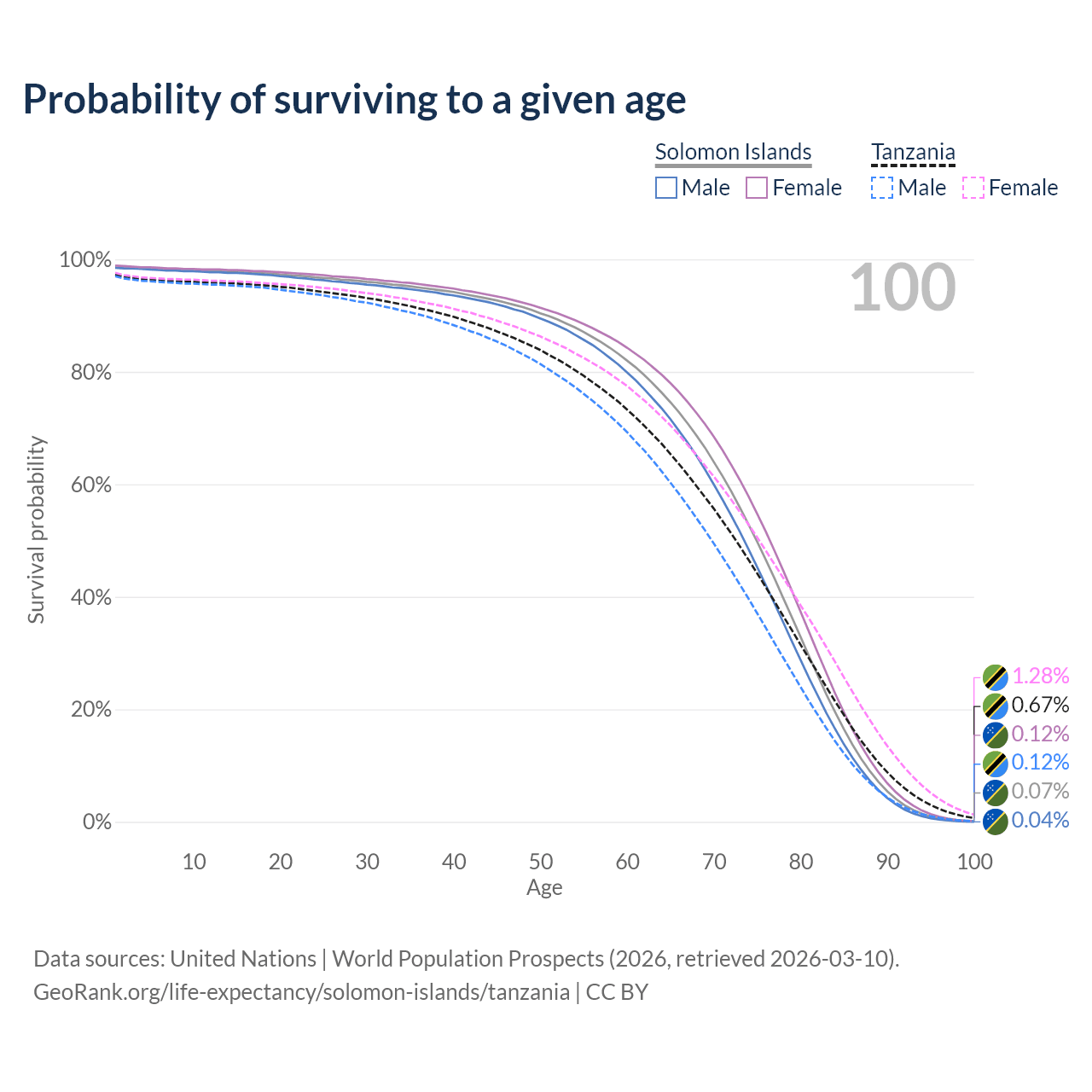 This life expectancy calculator shows the odds of living to 100, 95, 90, and below based on current age for both males and females in the Solomon Islands and Tanzania, along with mean and median age of death. The calculations are based on the 2026 life tables (actuarial tables) from the UN World Population Prospects.