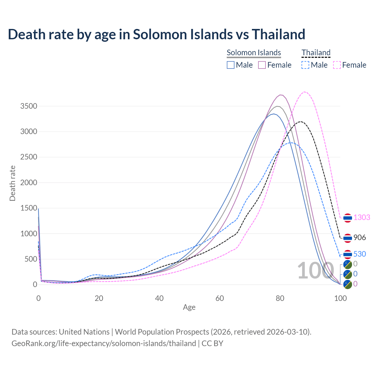 In the Solomon Islands, the most common age of death is 79, compared to 87 in Thailand. The median age of death is 74.9 in the Solomon Islands and 81.8 in Thailand, meaning only half of each cohort is expected to live past that age.