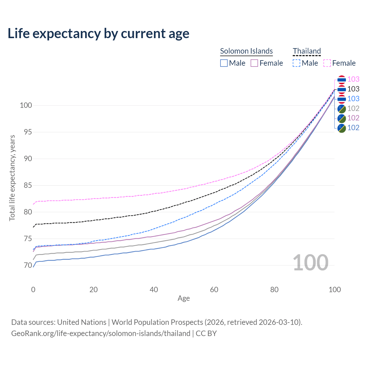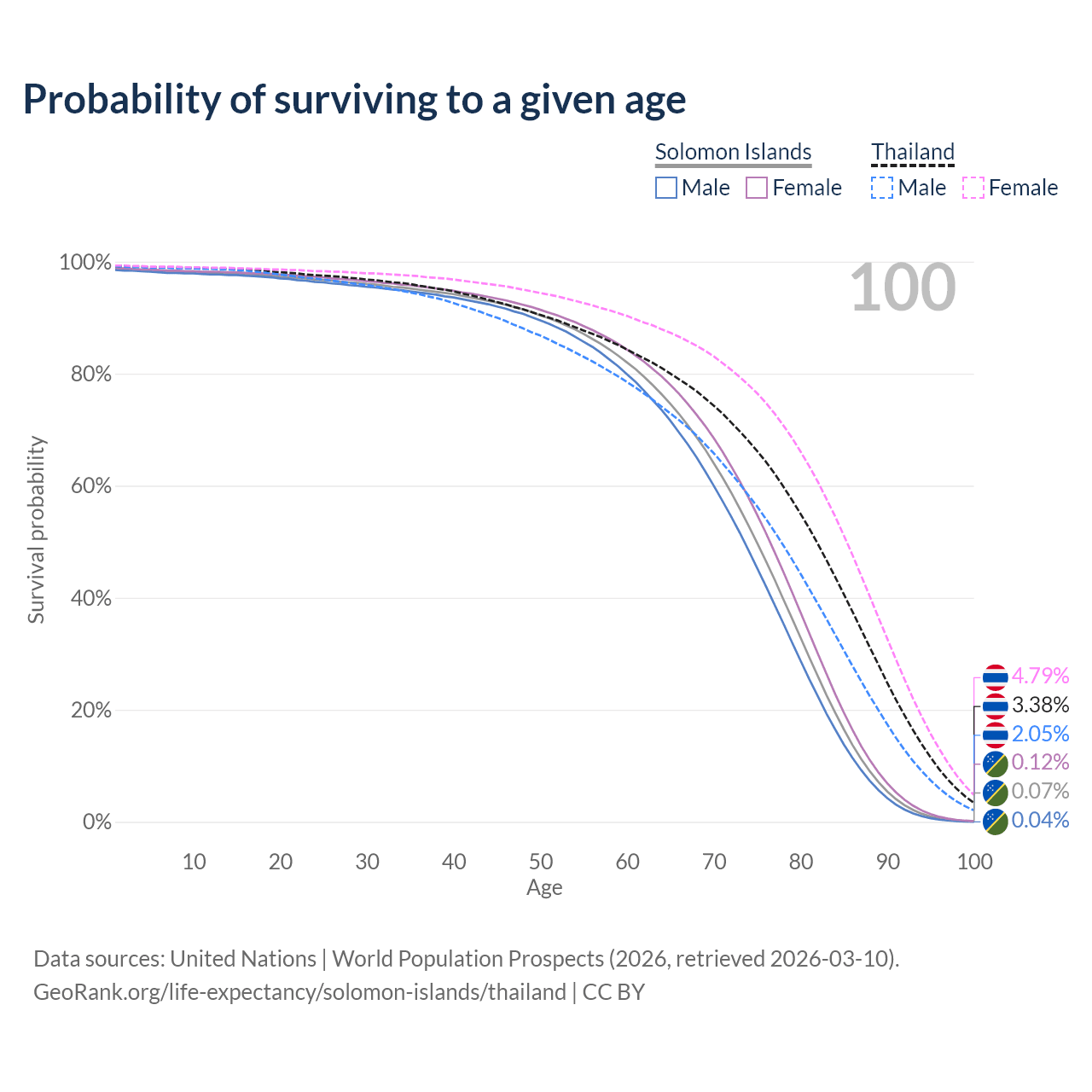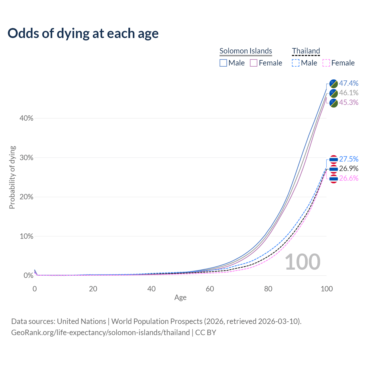 This life expectancy calculator shows the odds of living to 100, 95, 90, and below based on current age for both males and females in the Solomon Islands and Thailand, along with mean and median age of death. The calculations are based on the 2026 life tables (actuarial tables) from the UN World Population Prospects.