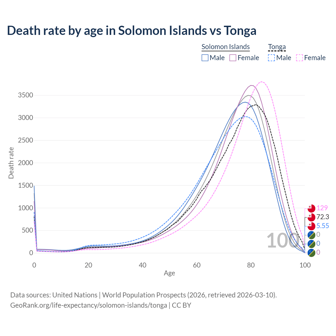 In the Solomon Islands, the most common age of death is 79, compared to 82 in Tonga. The median age of death is 74.9 in the Solomon Islands and 77 in Tonga, meaning only half of each cohort is expected to live past that age.