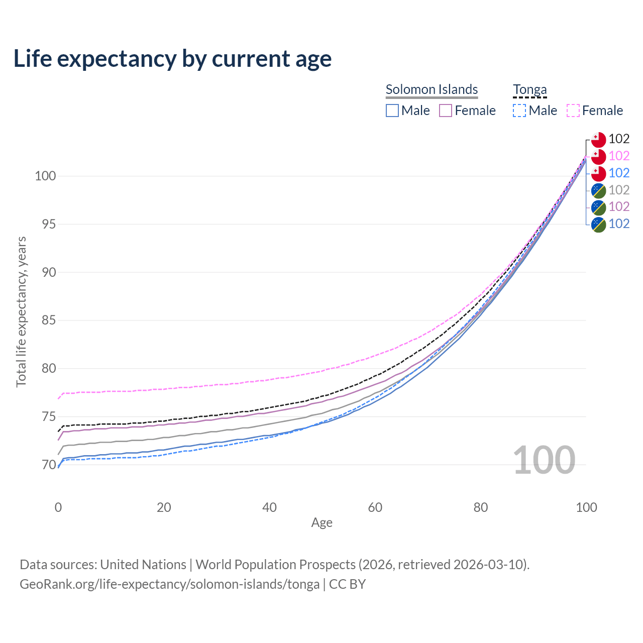 This life expectancy calculator shows the odds of living to 100, 95, 90, and below based on current age for both males and females in the Solomon Islands and Tonga, along with mean and median age of death. The calculations are based on the 2026 life tables (actuarial tables) from the UN World Population Prospects.