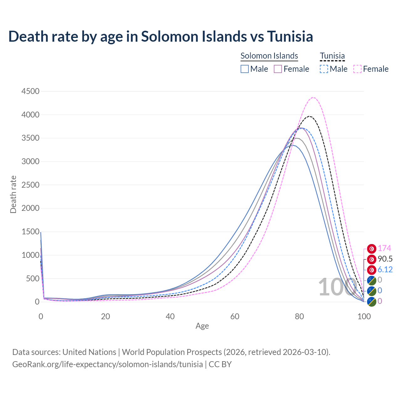 This life expectancy calculator shows the odds of living to 100, 95, 90, and below based on current age for both males and females in the Solomon Islands and Tunisia, along with mean and median age of death. The calculations are based on the 2026 life tables (actuarial tables) from the UN World Population Prospects.