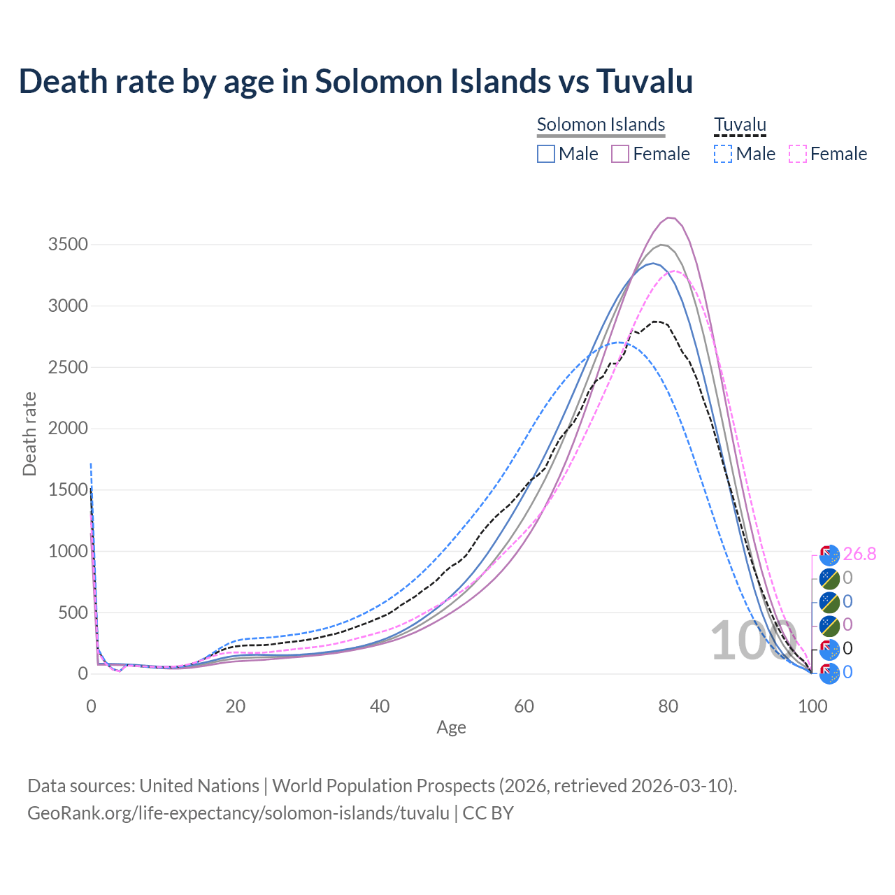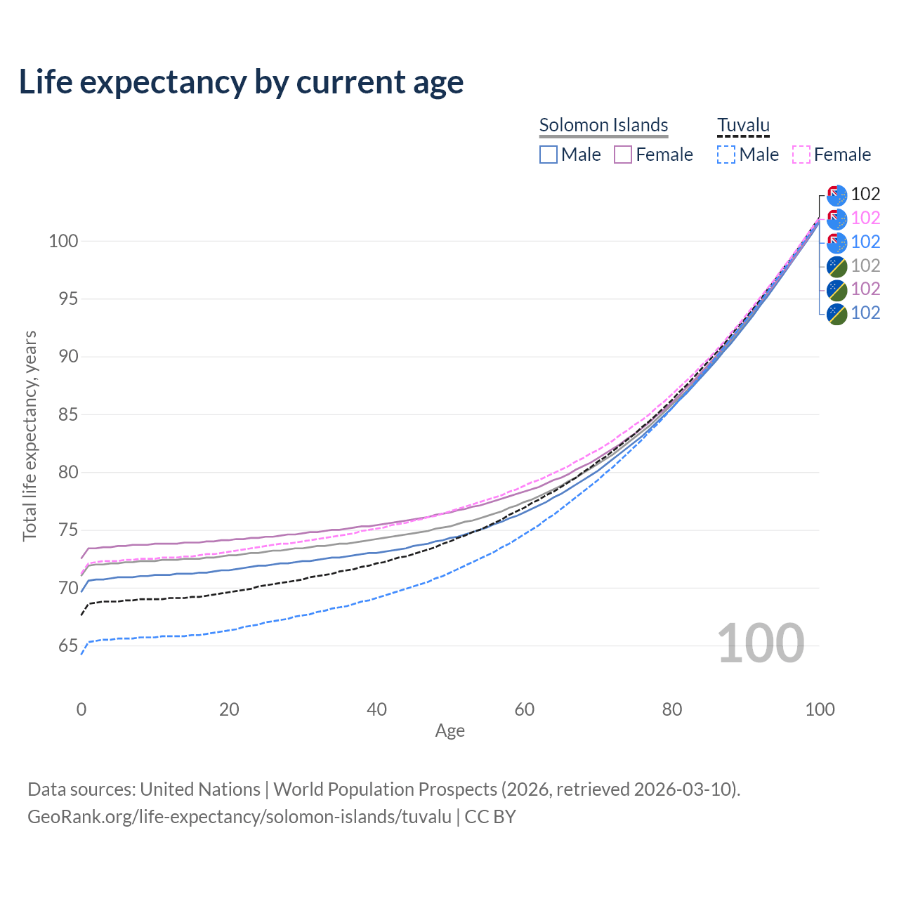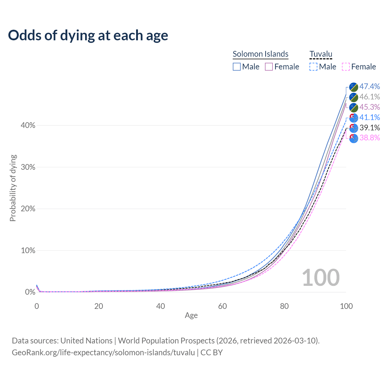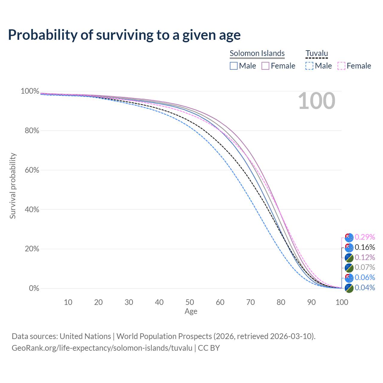 This life expectancy calculator shows the odds of living to 100, 95, 90, and below based on current age for both males and females in the Solomon Islands and Tuvalu, along with mean and median age of death. The calculations are based on the 2026 life tables (actuarial tables) from the UN World Population Prospects.