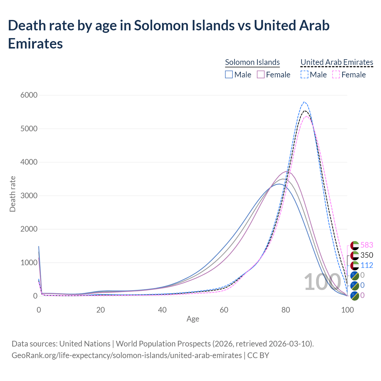 In the Solomon Islands, the most common age of death is 79, compared to 86 in the United Arab Emirates. The median age of death is 74.9 in the Solomon Islands and 85.6 in the United Arab Emirates, meaning only half of each cohort is expected to live past that age.
