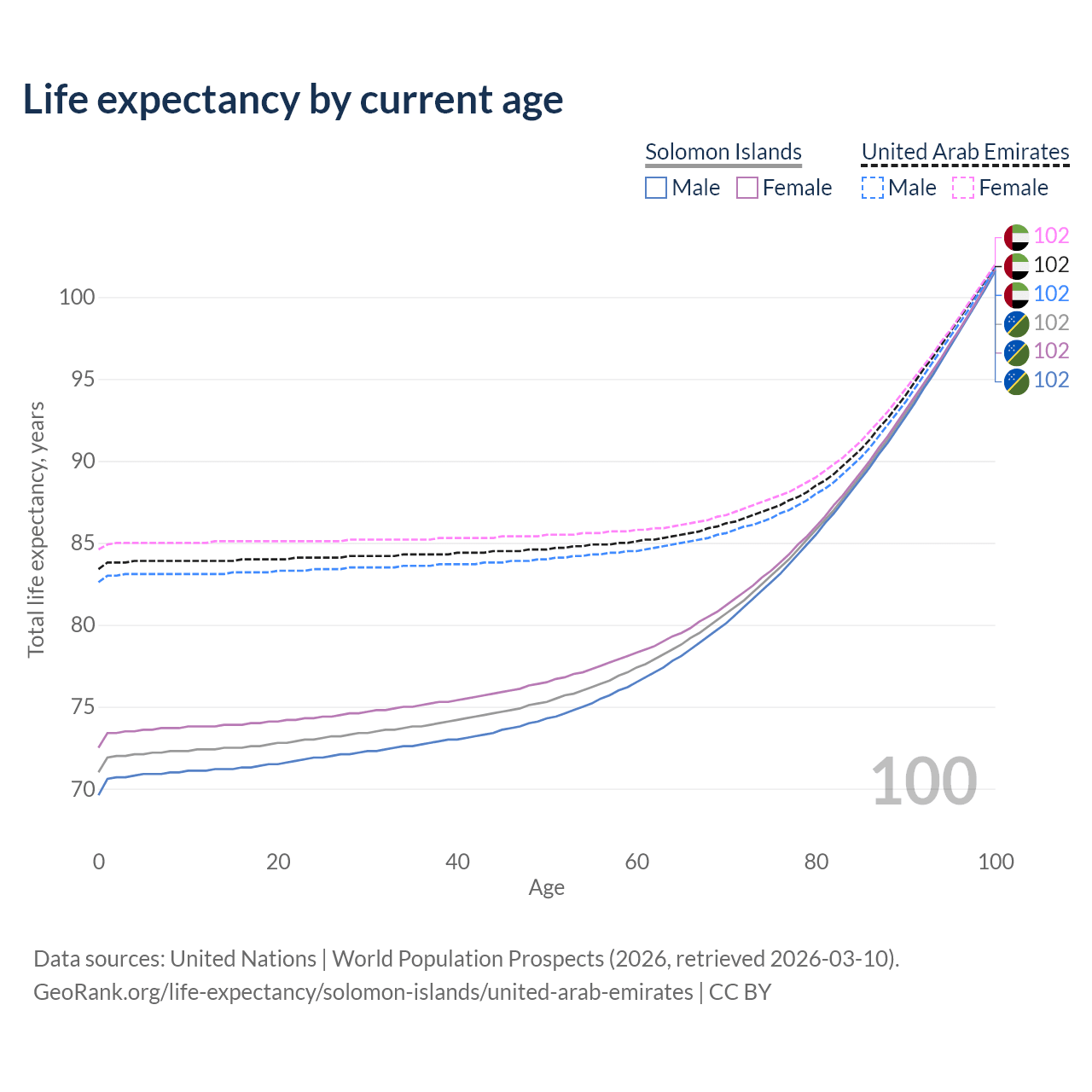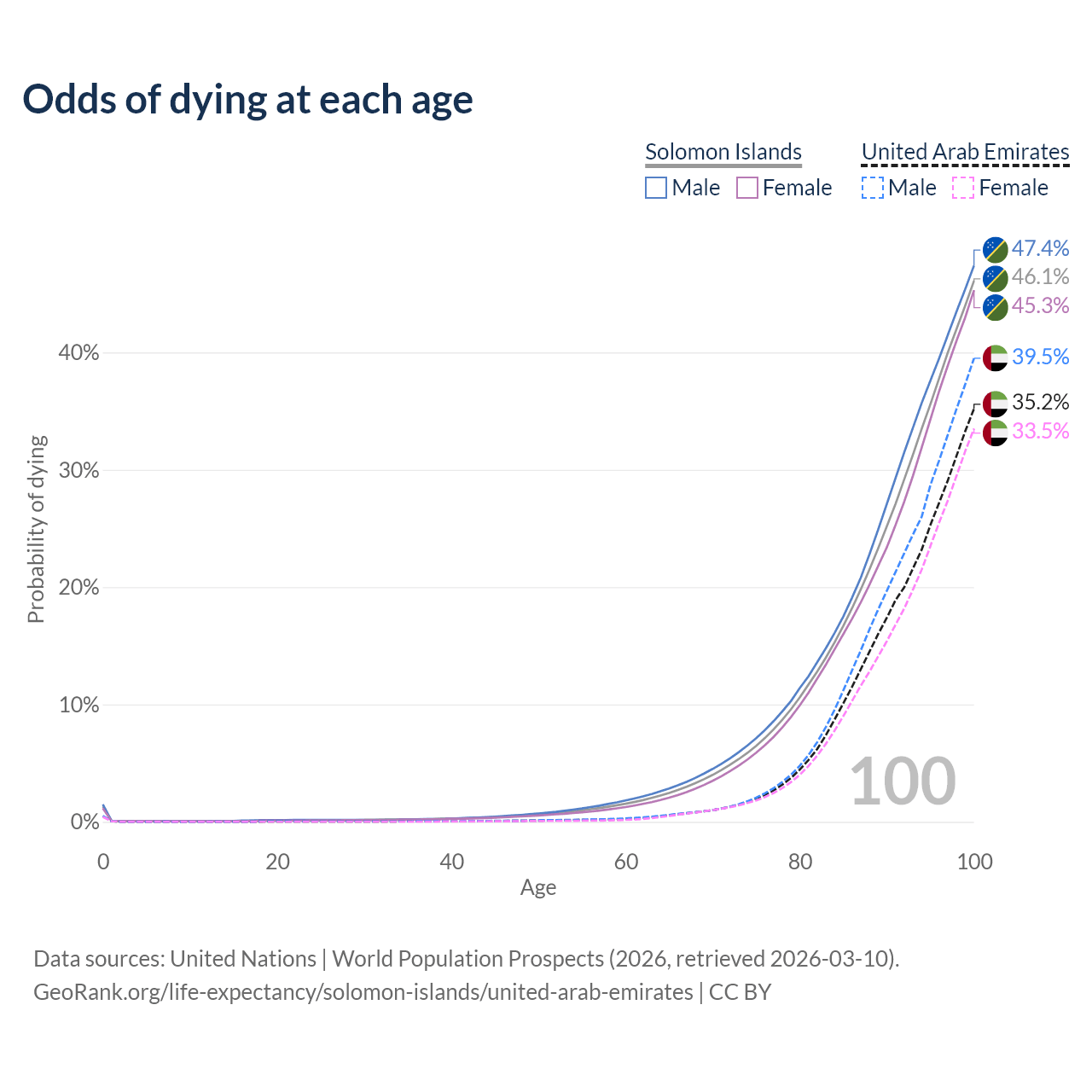 This life expectancy calculator shows the odds of living to 100, 95, 90, and below based on current age for both males and females in the Solomon Islands and the United Arab Emirates, along with mean and median age of death. The calculations are based on the 2026 life tables (actuarial tables) from the UN World Population Prospects.