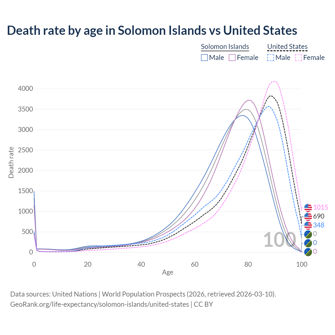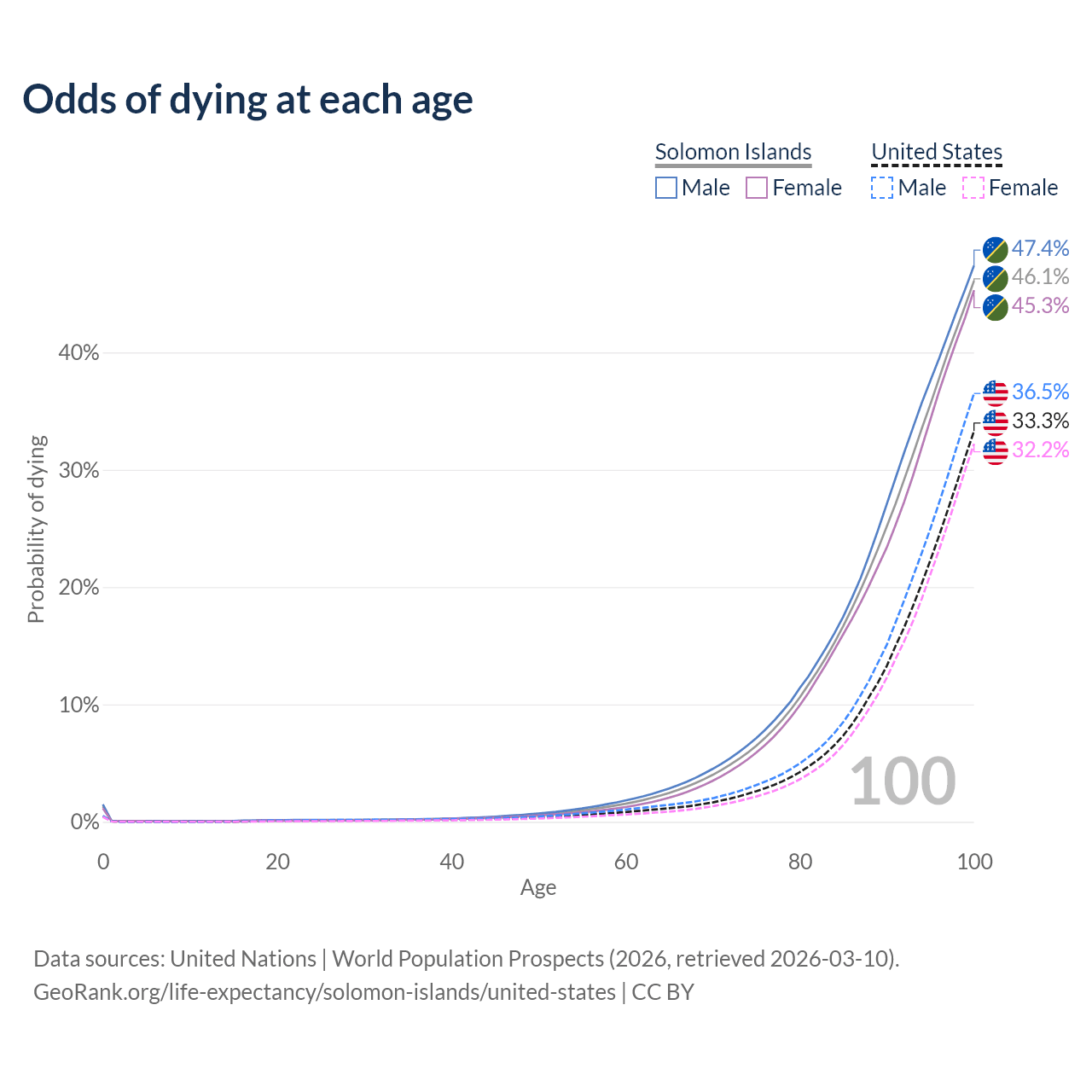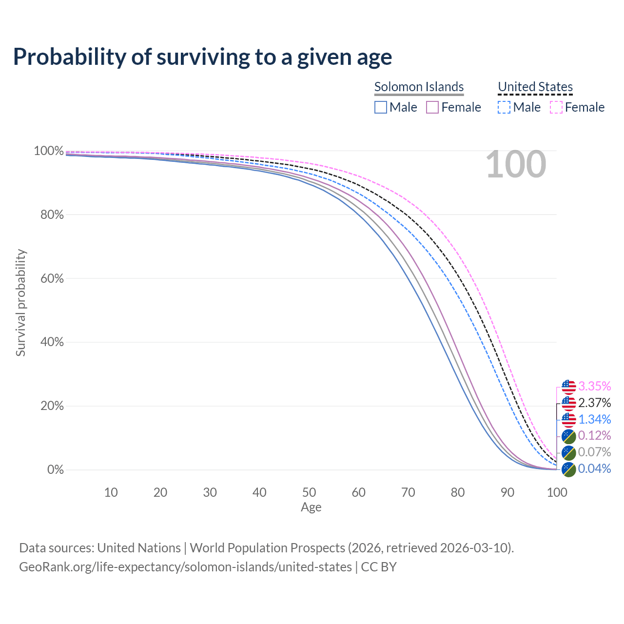 This life expectancy calculator shows the odds of living to 100, 95, 90, and below based on current age for both males and females in the Solomon Islands and the United States, along with mean and median age of death. The calculations are based on the 2026 life tables (actuarial tables) from the UN World Population Prospects.
