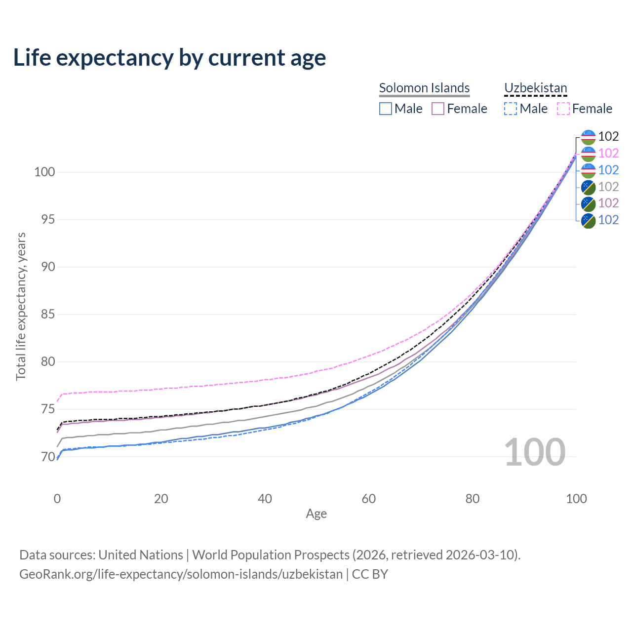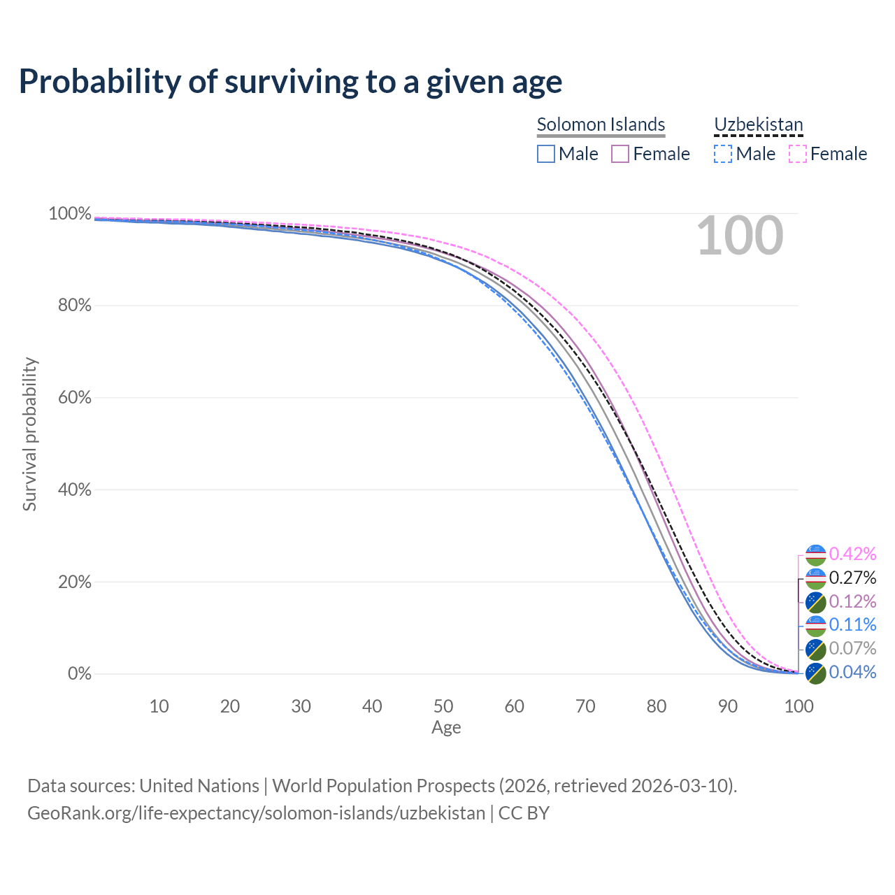 This life expectancy calculator shows the odds of living to 100, 95, 90, and below based on current age for both males and females in the Solomon Islands and Uzbekistan, along with mean and median age of death. The calculations are based on the 2026 life tables (actuarial tables) from the UN World Population Prospects.