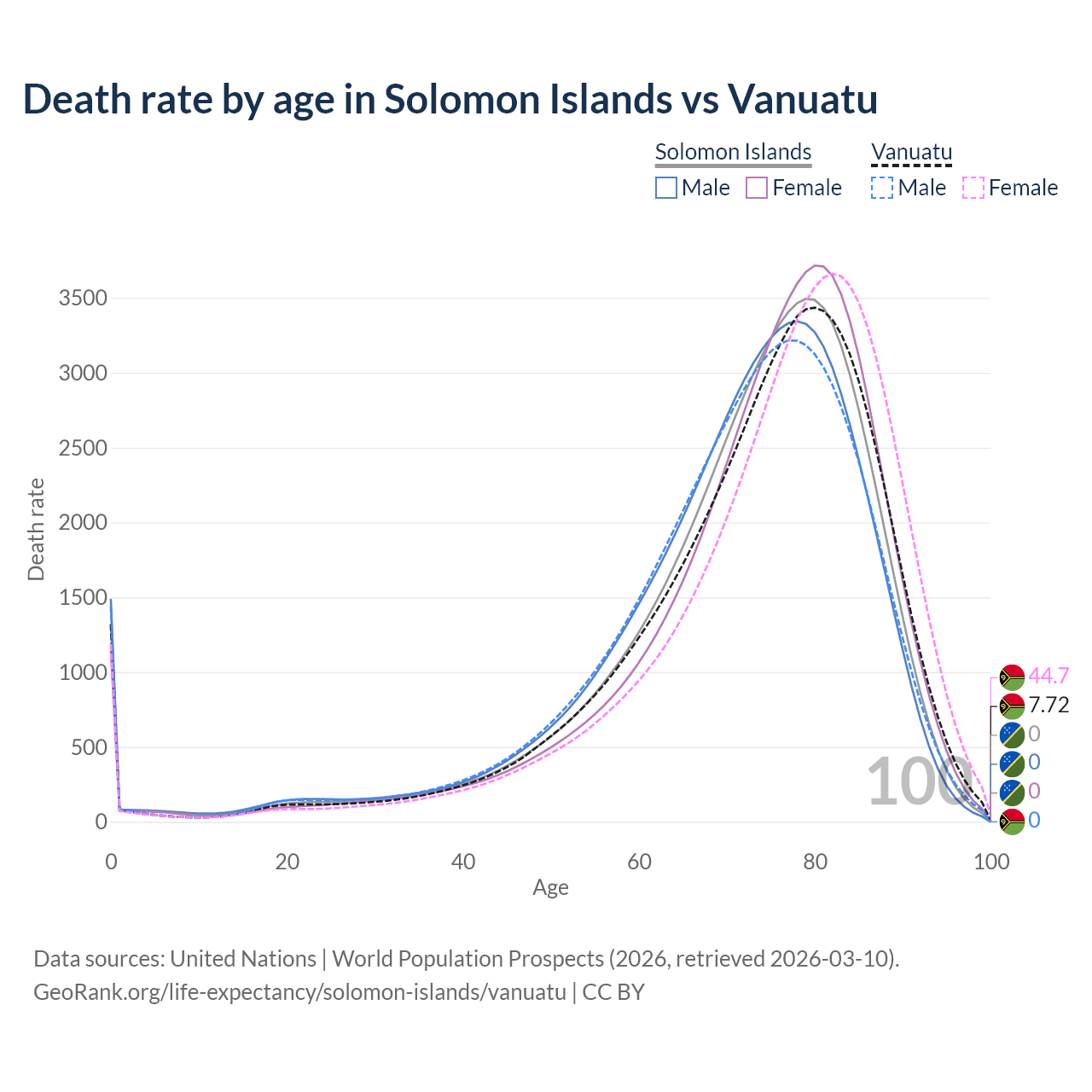In the Solomon Islands, the most common age of death is 79, compared to 80 in Vanuatu. The median age of death is 74.9 in the Solomon Islands and 75.9 in Vanuatu, meaning only half of each cohort is expected to live past that age.