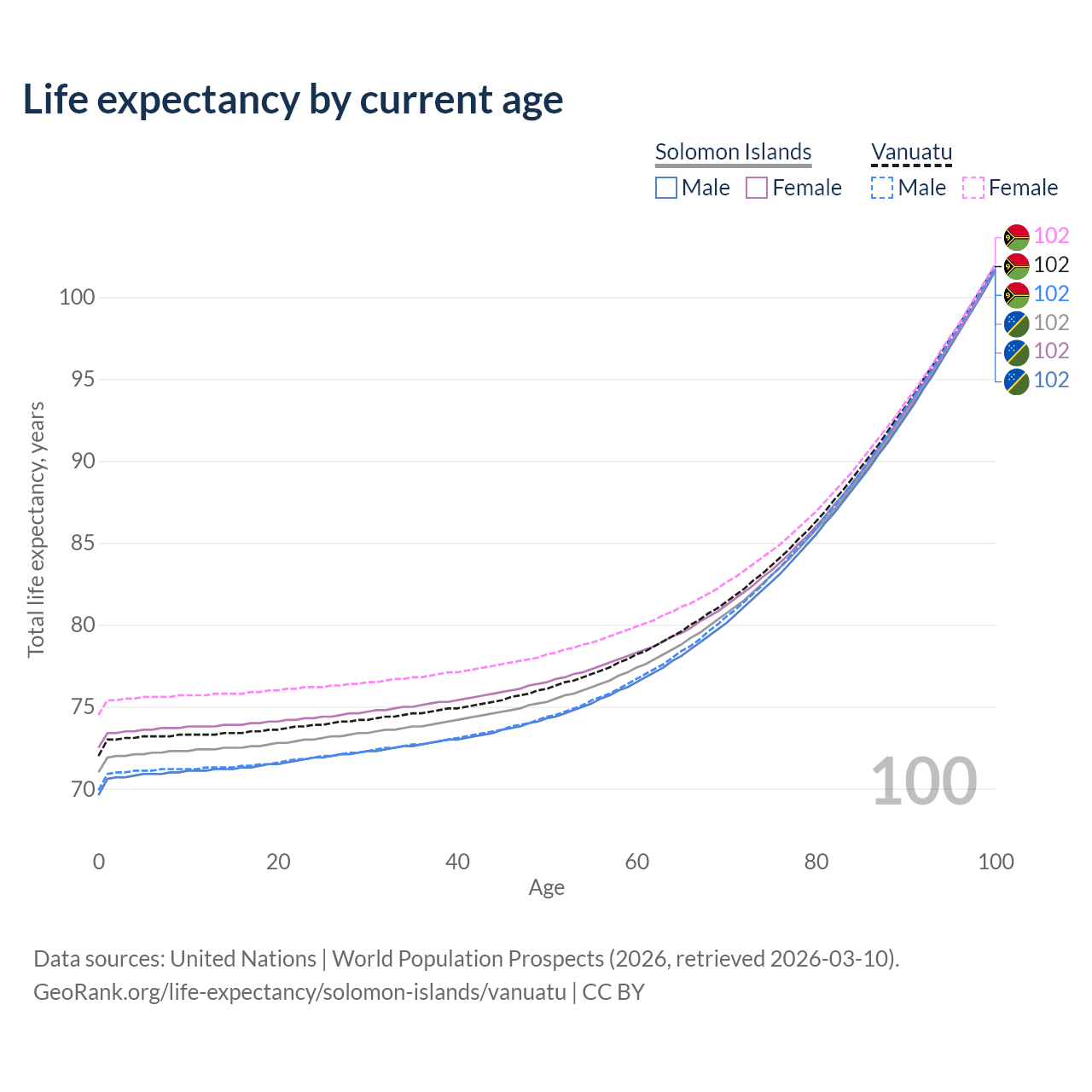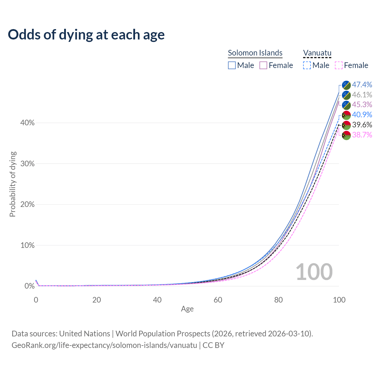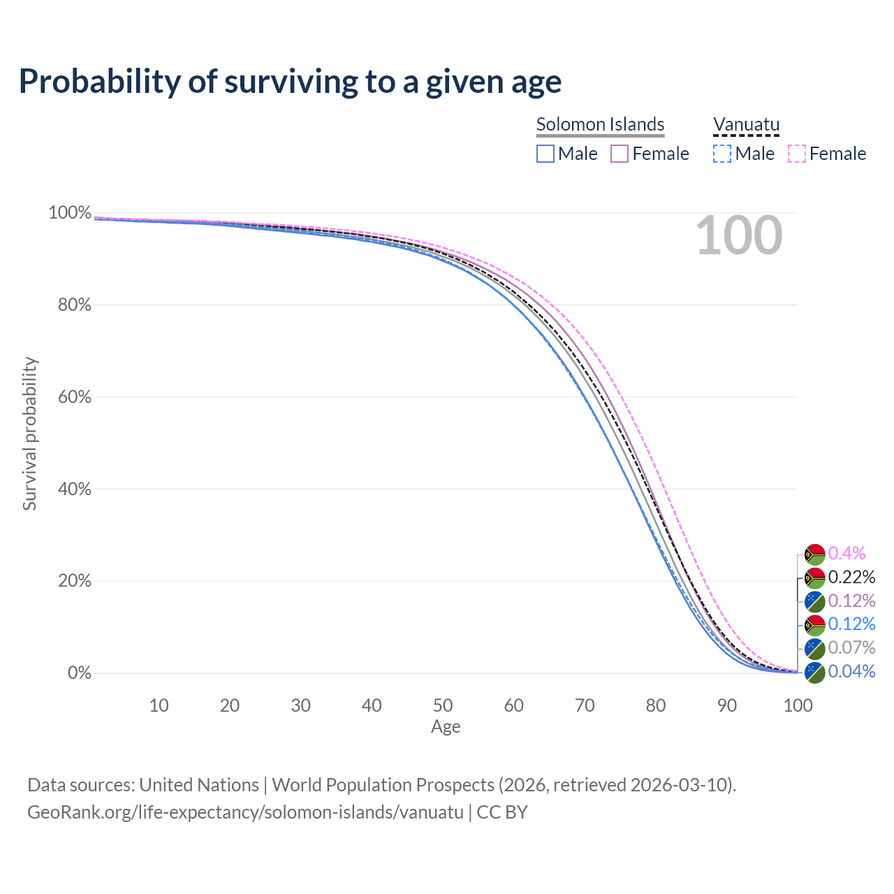 This life expectancy calculator shows the odds of living to 100, 95, 90, and below based on current age for both males and females in the Solomon Islands and Vanuatu, along with mean and median age of death. The calculations are based on the 2026 life tables (actuarial tables) from the UN World Population Prospects.