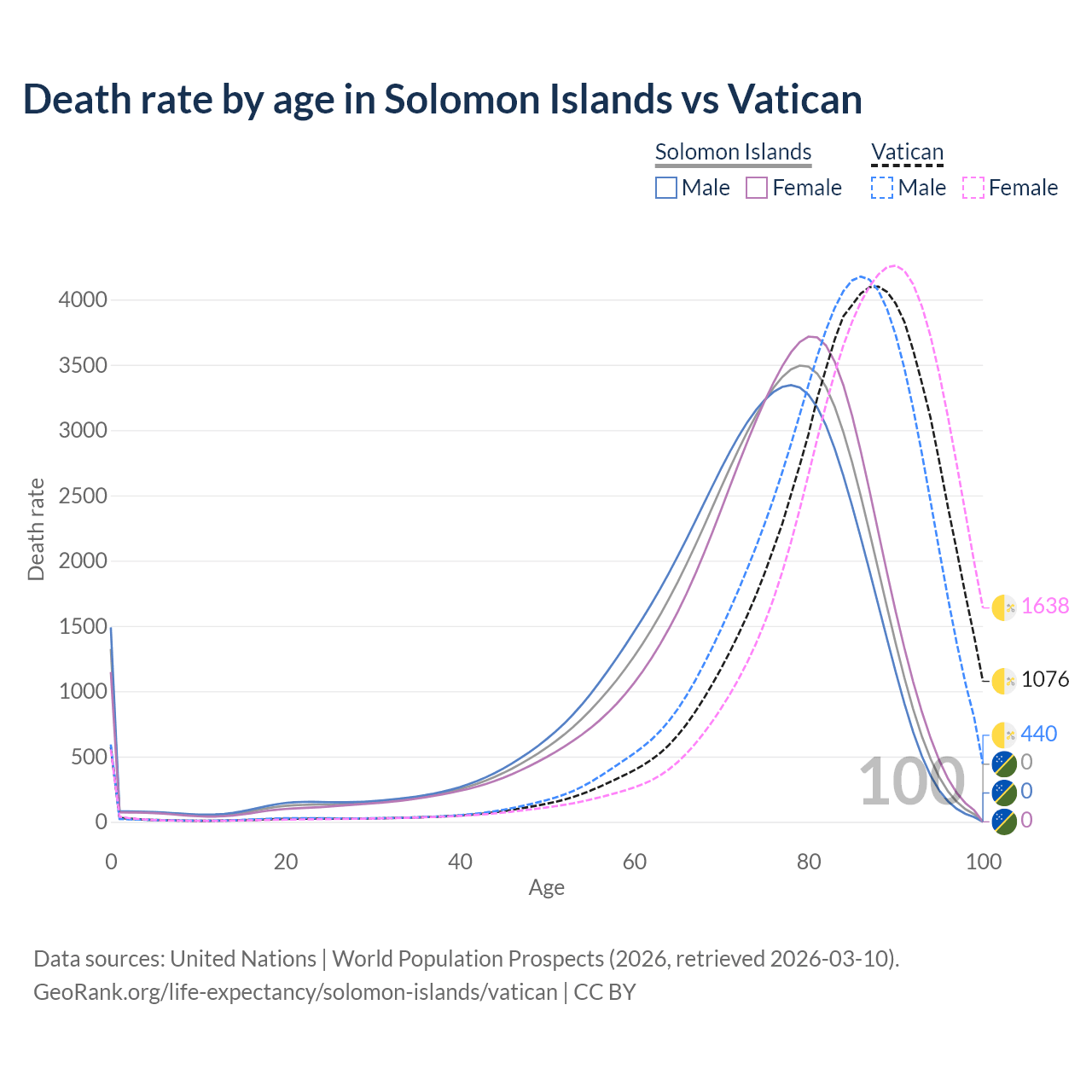 In the Solomon Islands, the most common age of death is 79, compared to 88 in the Vatican. The median age of death is 74.9 in the Solomon Islands and 85.7 in the Vatican, meaning only half of each cohort is expected to live past that age.