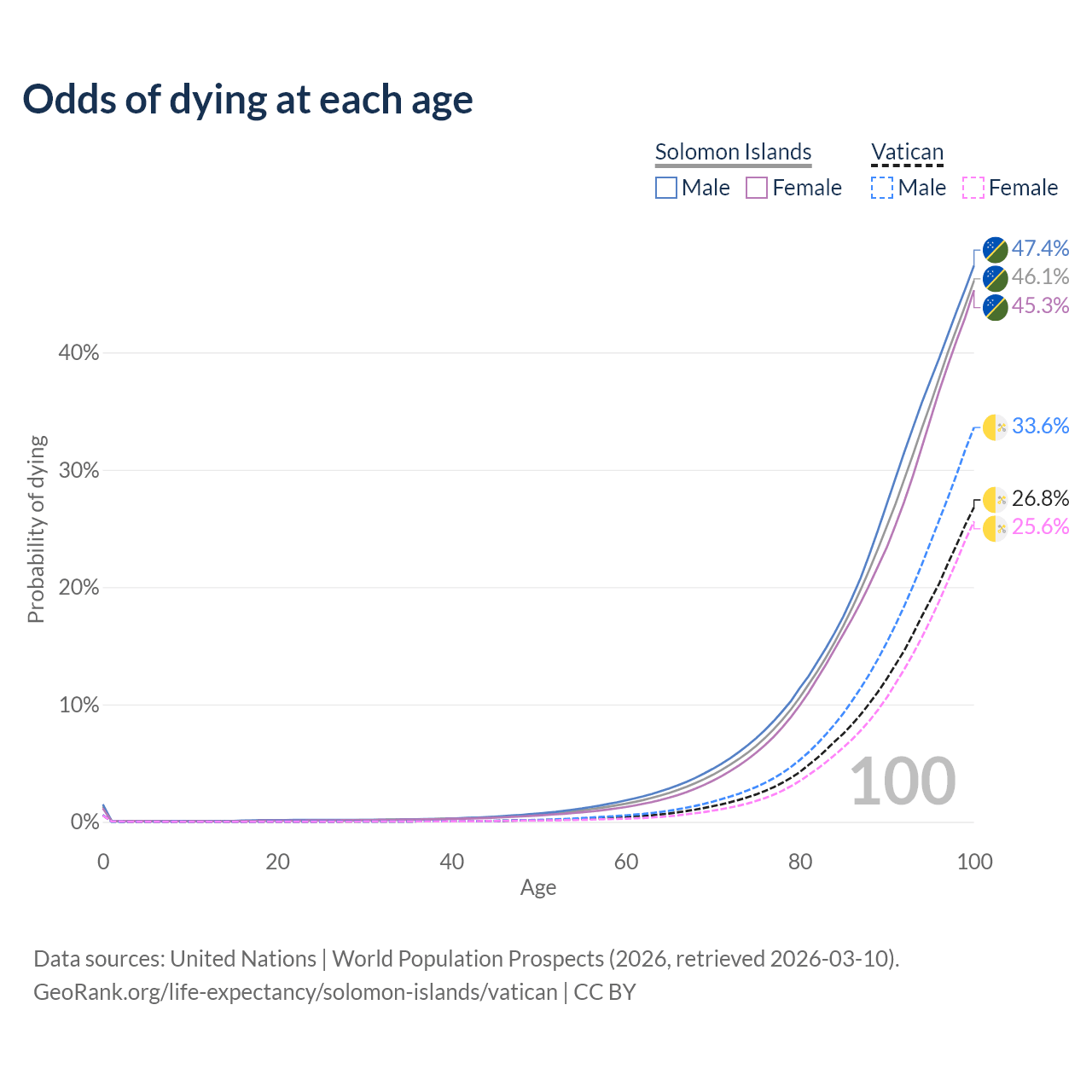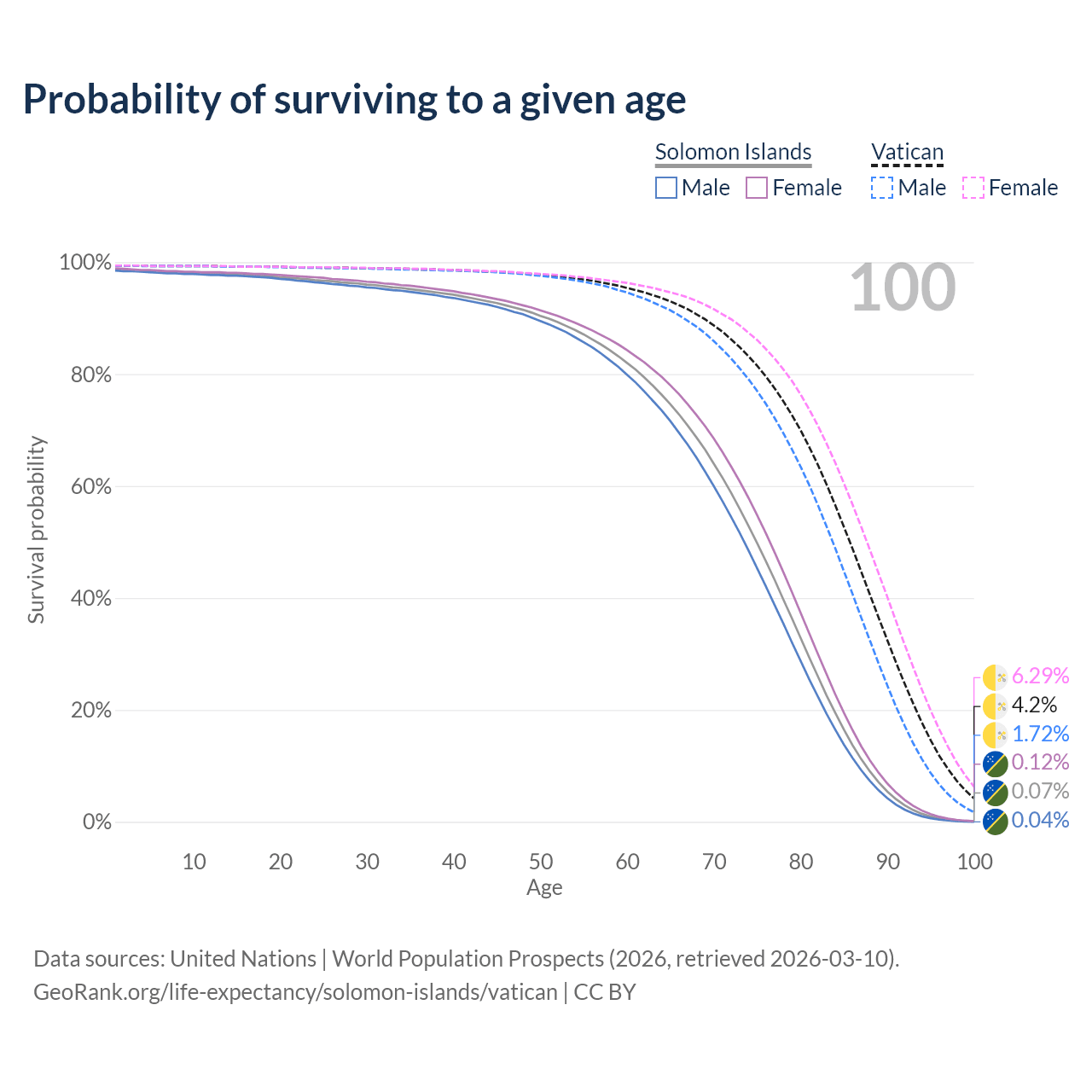 This life expectancy calculator shows the odds of living to 100, 95, 90, and below based on current age for both males and females in the Solomon Islands and the Vatican, along with mean and median age of death. The calculations are based on the 2026 life tables (actuarial tables) from the UN World Population Prospects.
