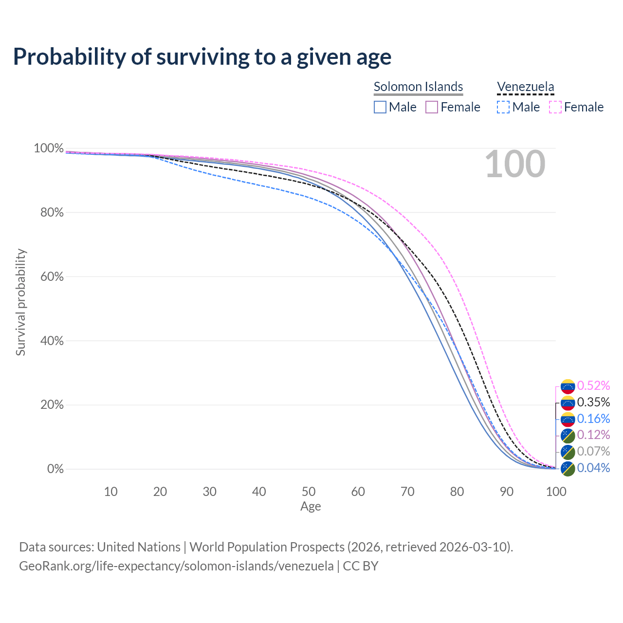 This life expectancy calculator shows the odds of living to 100, 95, 90, and below based on current age for both males and females in the Solomon Islands and Venezuela, along with mean and median age of death. The calculations are based on the 2026 life tables (actuarial tables) from the UN World Population Prospects.