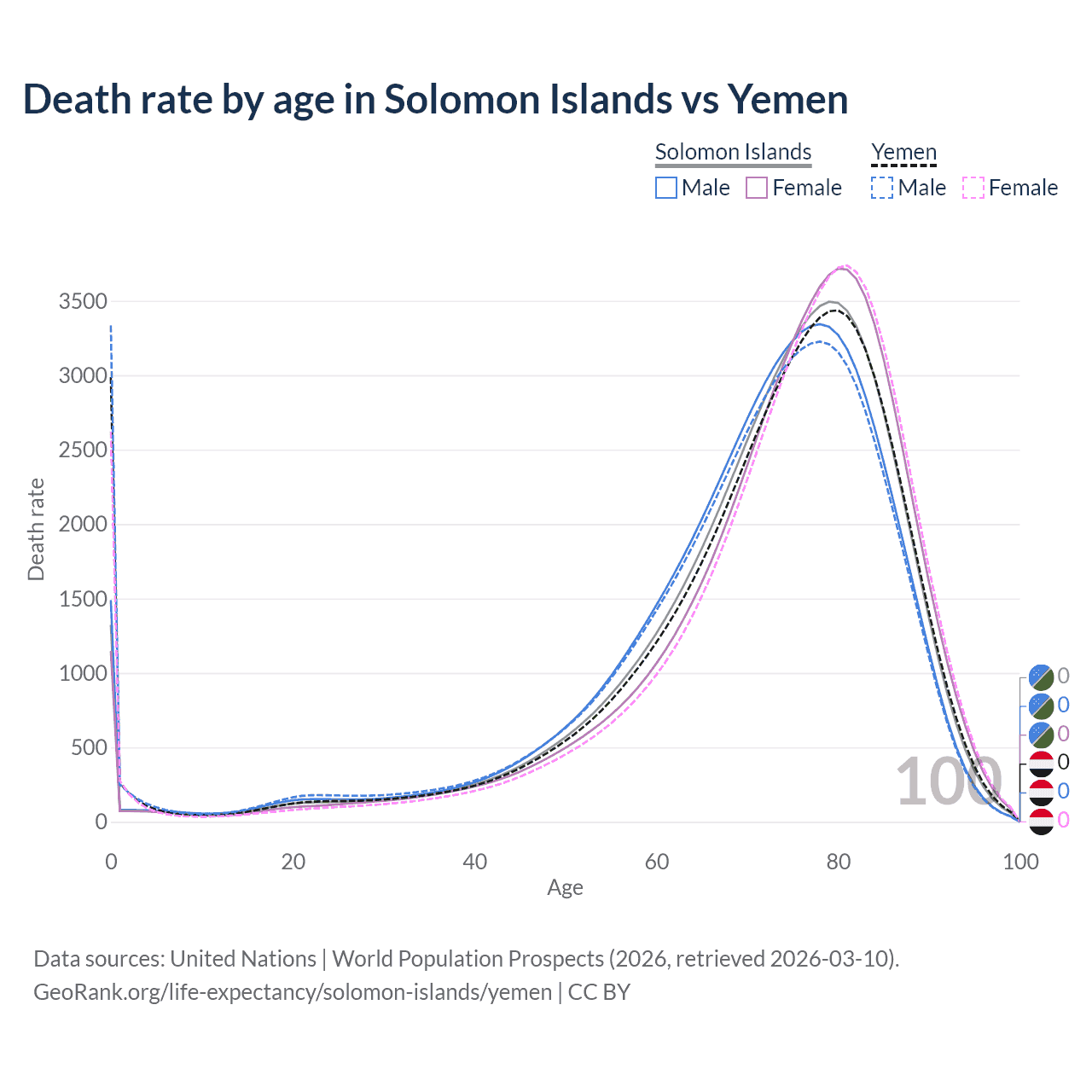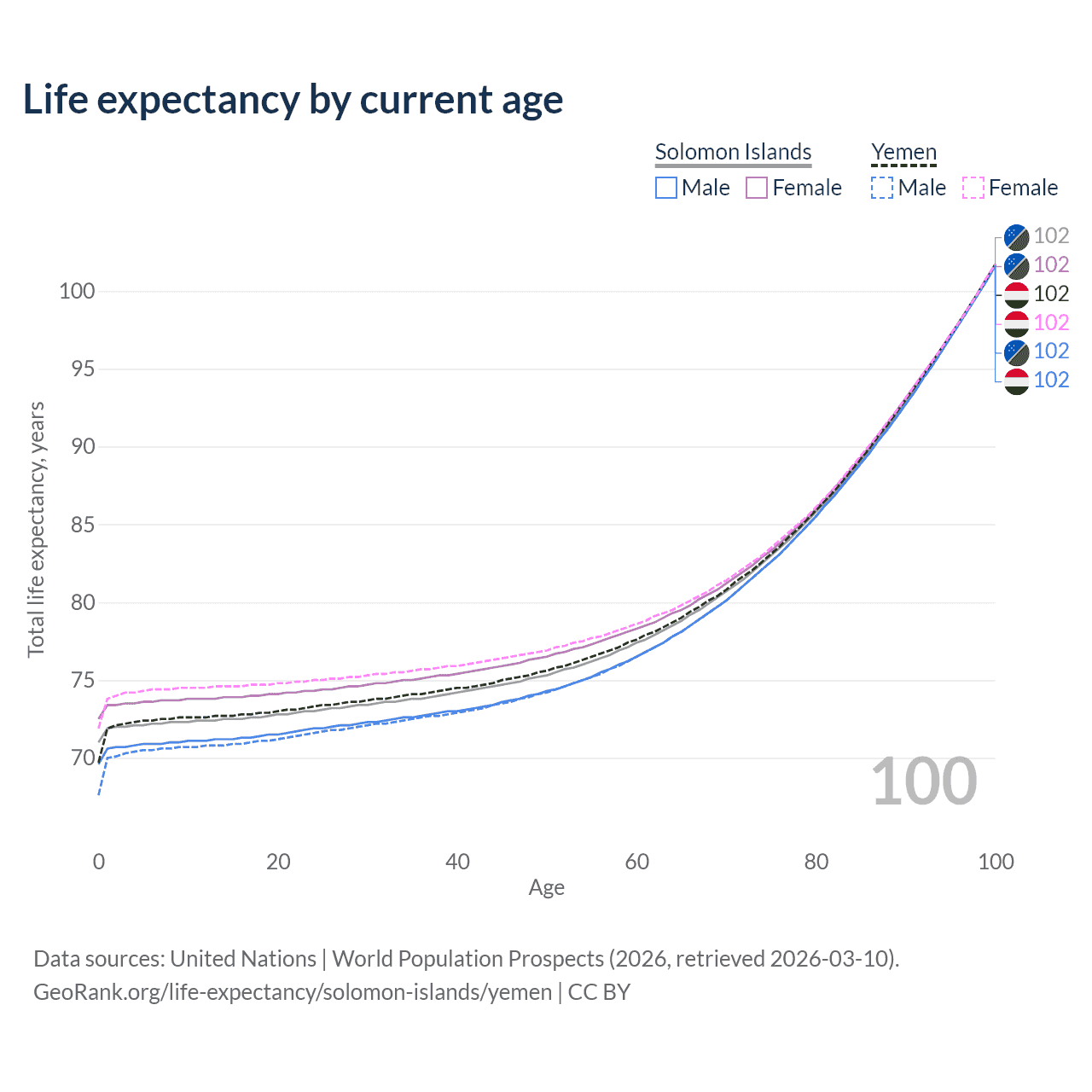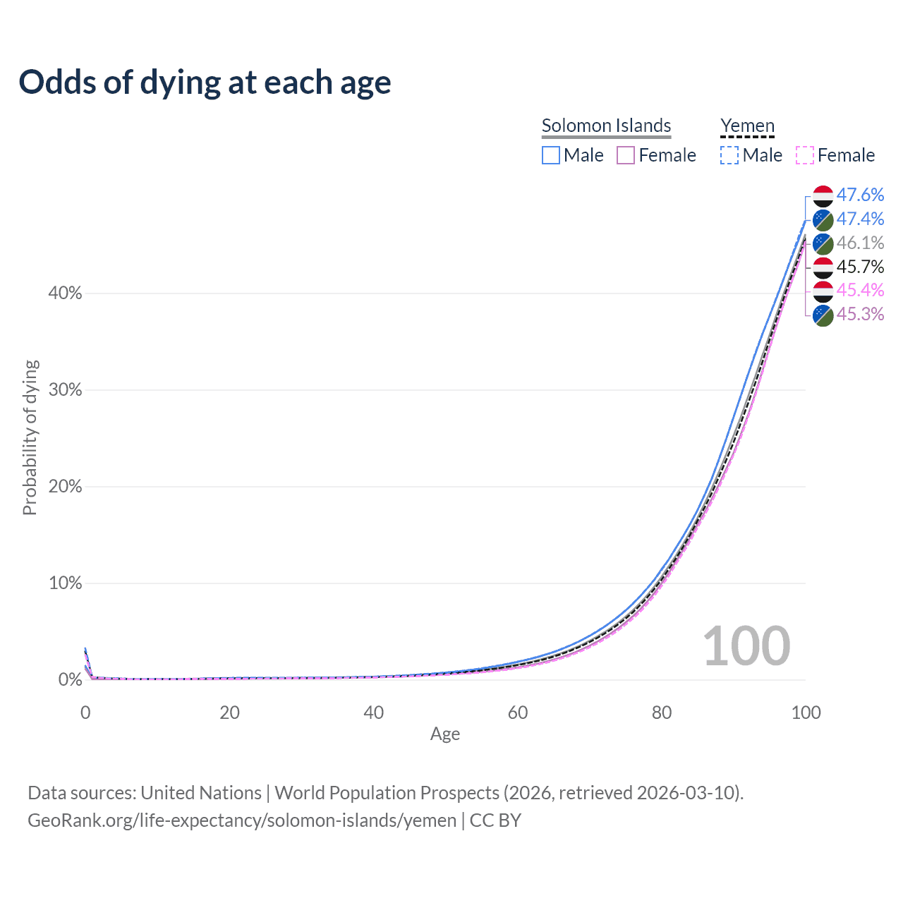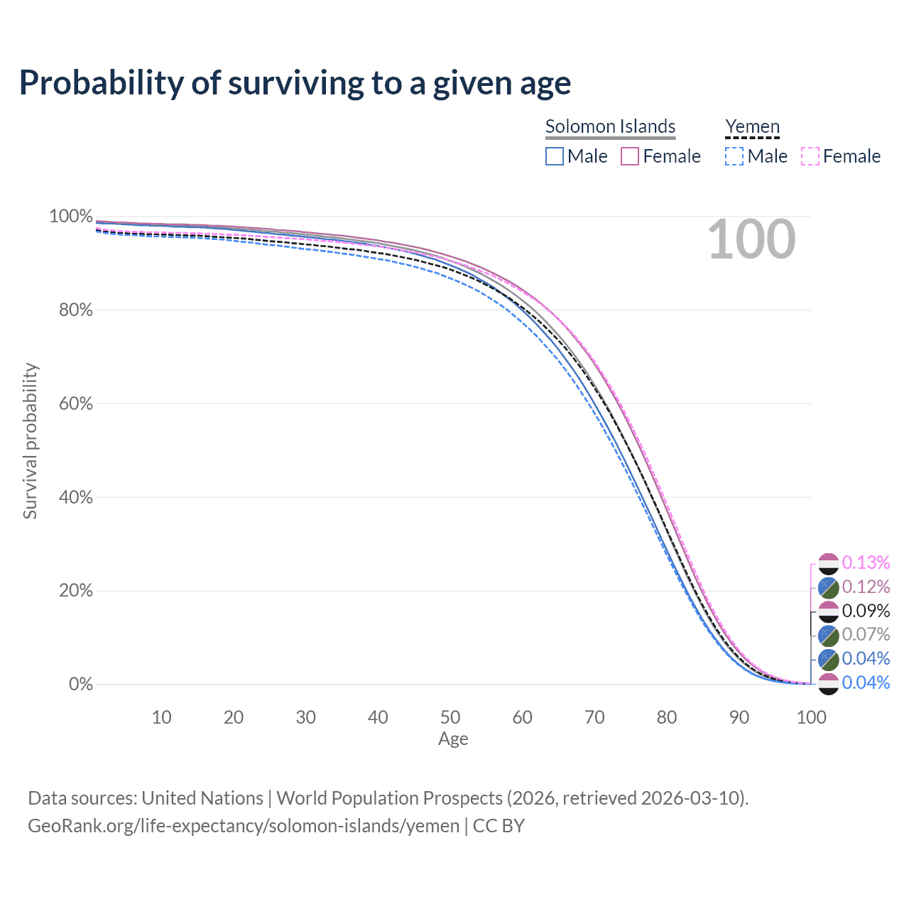 This life expectancy calculator shows the odds of living to 100, 95, 90, and below based on current age for both males and females in the Solomon Islands and Yemen, along with mean and median age of death. The calculations are based on the 2026 life tables (actuarial tables) from the UN World Population Prospects.
