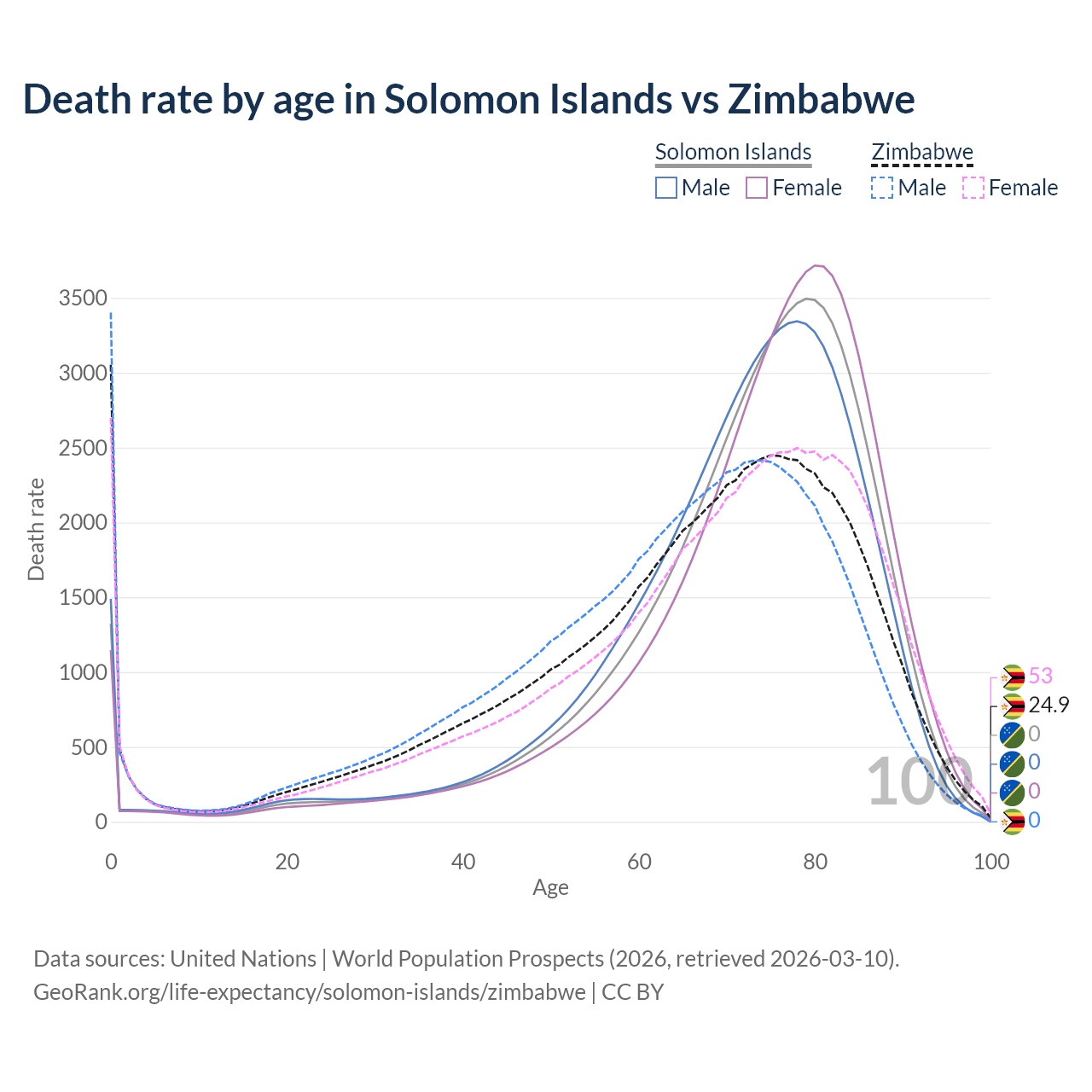 In the Solomon Islands, the most common age of death is 79, compared to 0 in Zimbabwe. The median age of death is 74.9 in the Solomon Islands and 68.8 in Zimbabwe, meaning only half of each cohort is expected to live past that age.