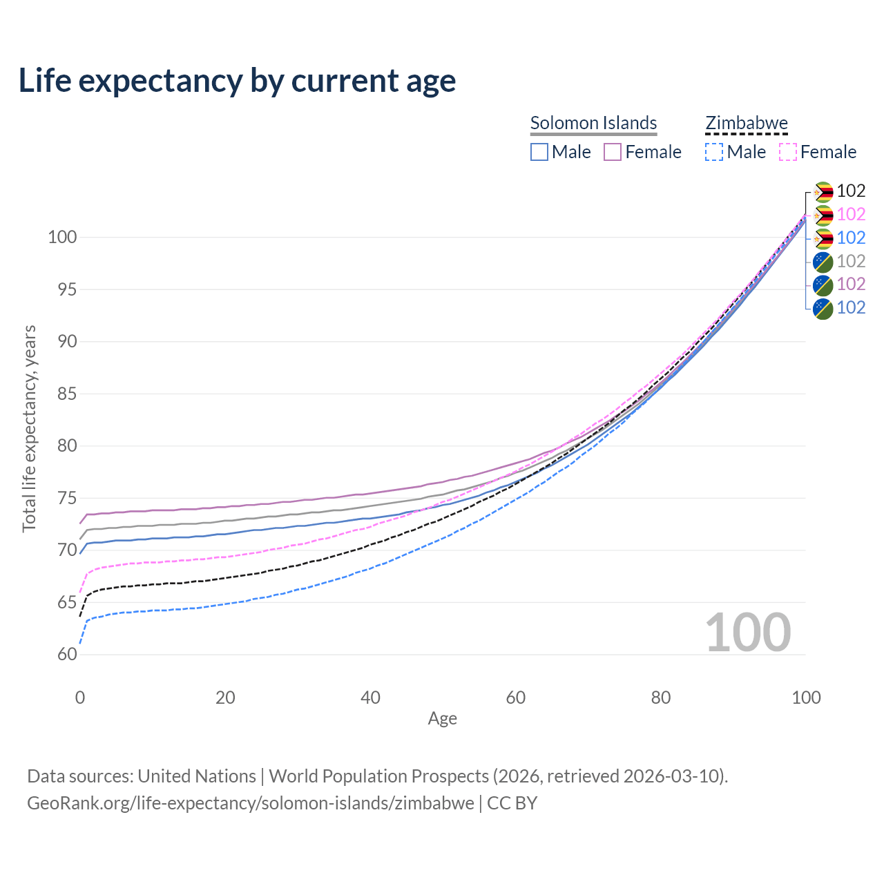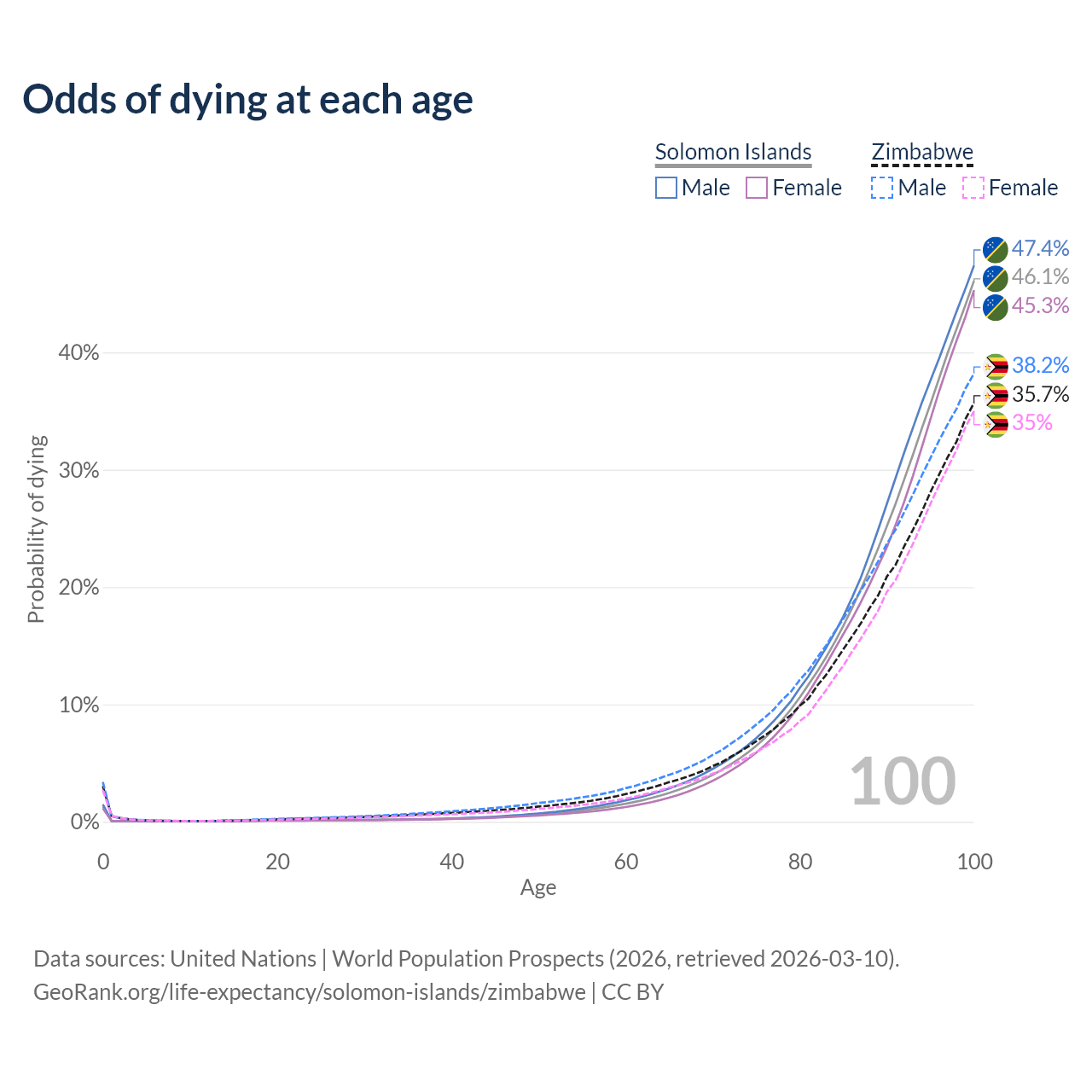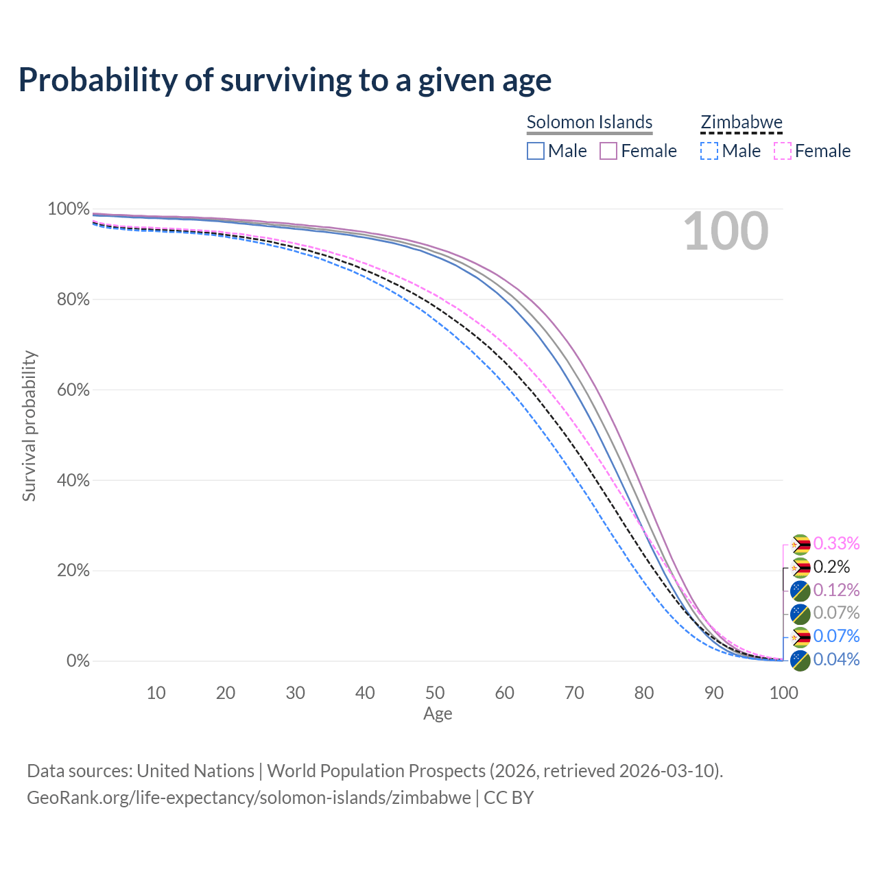 This life expectancy calculator shows the odds of living to 100, 95, 90, and below based on current age for both males and females in the Solomon Islands and Zimbabwe, along with mean and median age of death. The calculations are based on the 2026 life tables (actuarial tables) from the UN World Population Prospects.