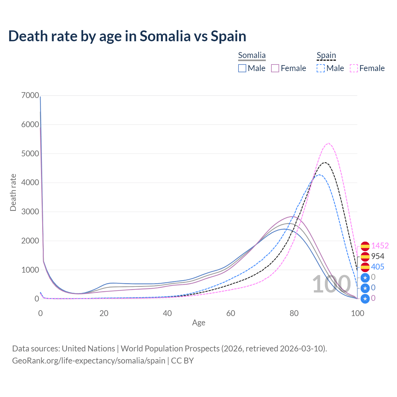 In Somalia, the most common age of death is 0, compared to 90 in Spain. The median age of death is 69 in Somalia and 87 in Spain, meaning only half of each cohort is expected to live past that age.