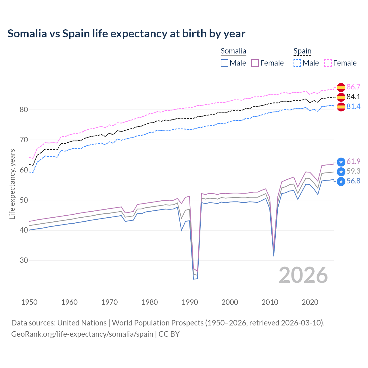 The average life expectancy at birth is 59.3 years in Somalia vs 84.1 in Spain. Somalia is ranked 192/197 by life expectancy, and Spain is 10/197. In Somalia, the life expectancy is 56.8 years for males and 61.9 years for females. In Spain, it's 81.4 years for males and 86.7 years for females.