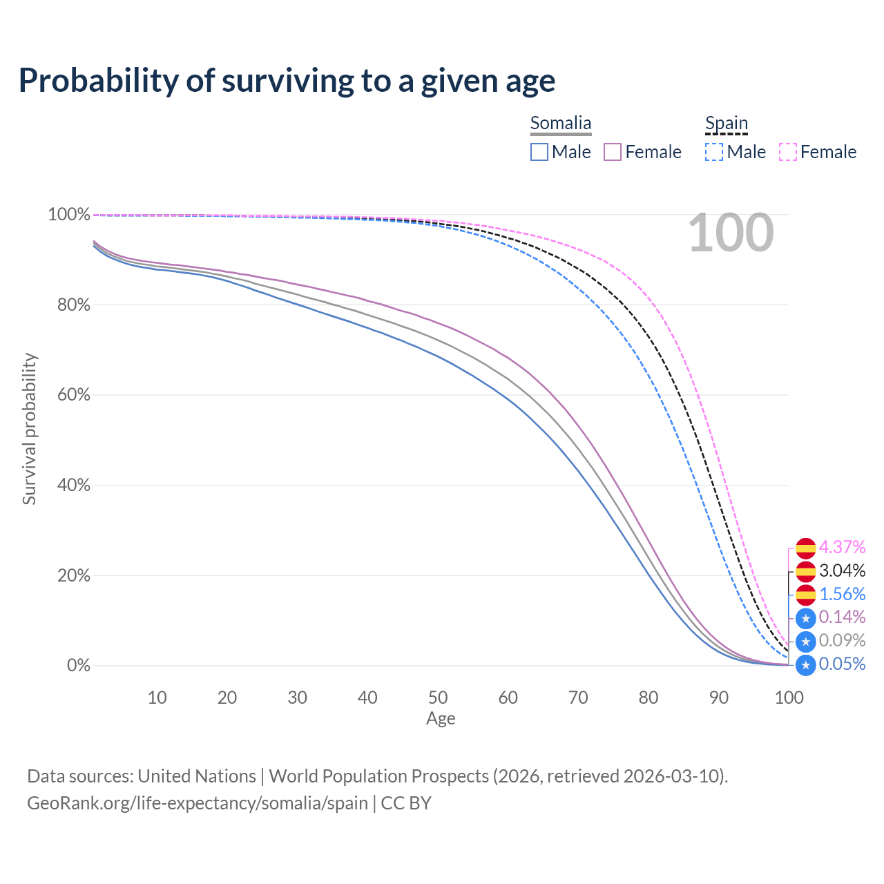 This life expectancy calculator shows the odds of living to 100, 95, 90, and below based on current age for both males and females in Somalia and Spain, along with mean and median age of death. The calculations are based on the 2026 life tables (actuarial tables) from the UN World Population Prospects.