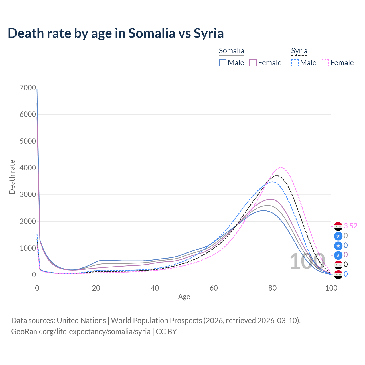The average life expectancy at birth is 59.3 years in Somalia vs 73.4 in Syria. Somalia is ranked 192/197 by life expectancy, and Syria is 108/197. In Somalia, the life expectancy is 56.8 years for males and 61.9 years for females. In Syria, it's 71 years for males and 75.9 years for females.