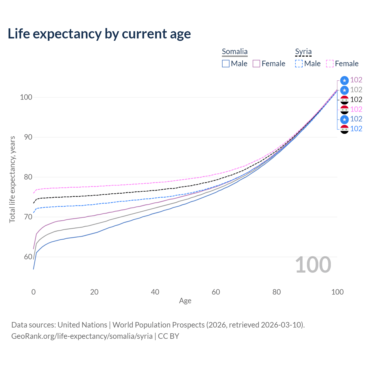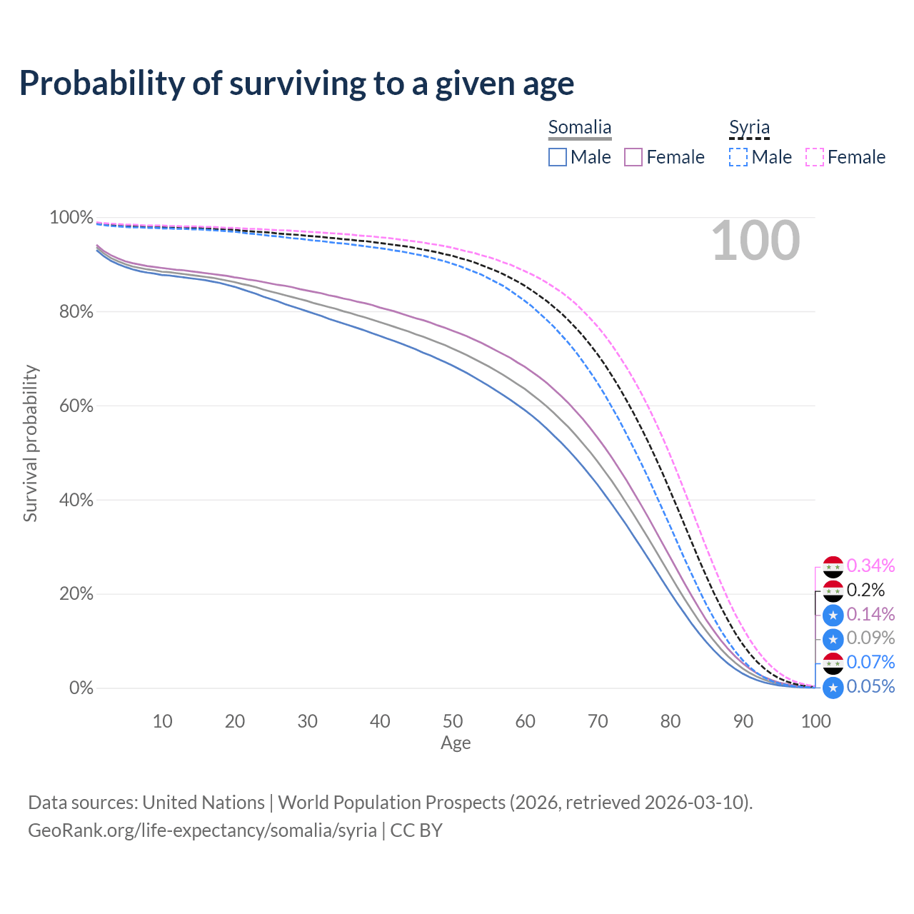 This life expectancy calculator shows the odds of living to 100, 95, 90, and below based on current age for both males and females in Somalia and Syria, along with mean and median age of death. The calculations are based on the 2026 life tables (actuarial tables) from the UN World Population Prospects.