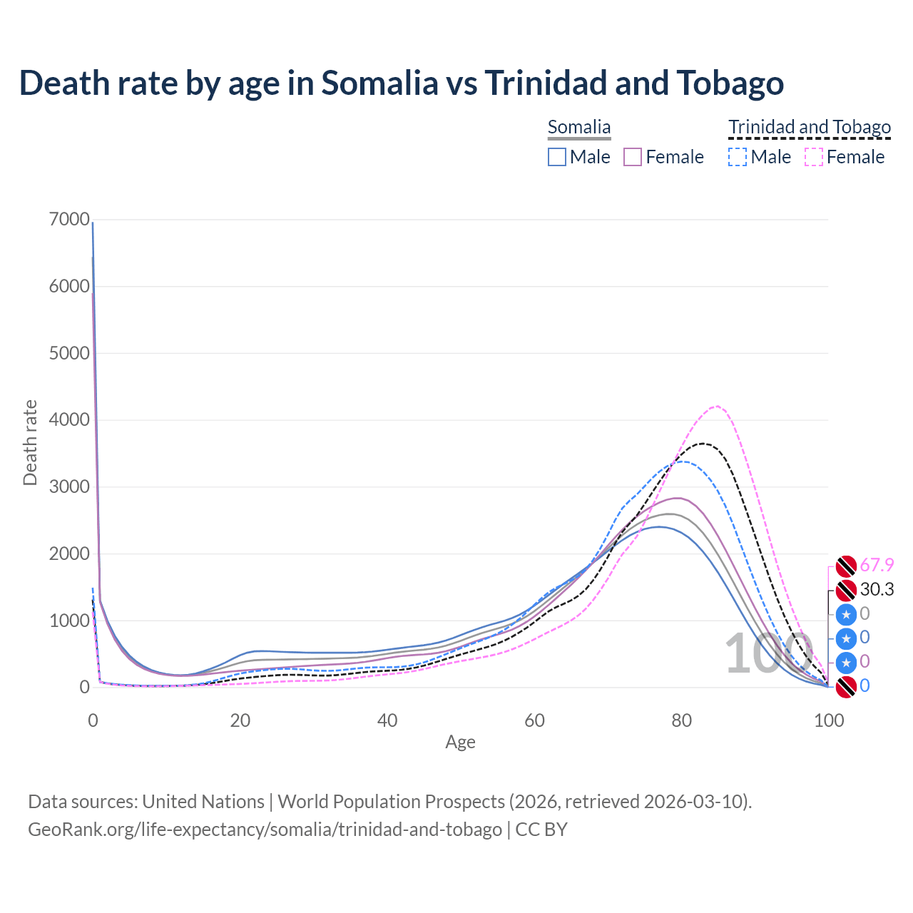 In Somalia, the most common age of death is 0, compared to 83 in Trinidad and Tobago. The median age of death is 69 in Somalia and 78.4 in Trinidad and Tobago, meaning only half of each cohort is expected to live past that age.